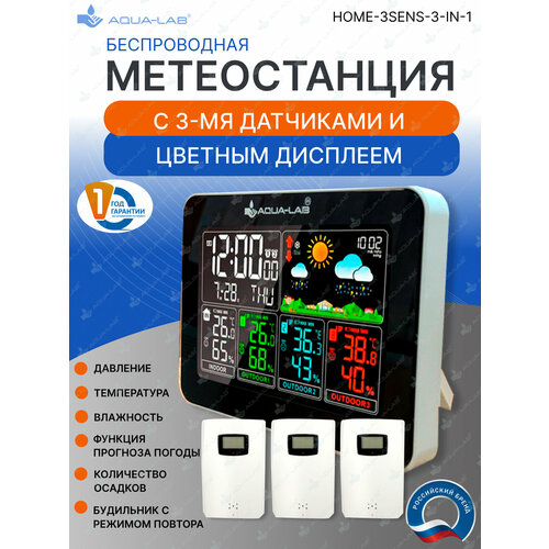 Домашняя погодная станция Aqua-Lab с 3 беспроводными выносными датчиками представляет собой многофункциональное устройство, которое позволяет контролировать погоду в помещении и на улице.