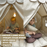 Домик для детей от бренда Вигвамия. Домик детский игровой размером 80х80см (основание) и высотой 110см отлично впишется в даже самую небольшую детскую. Палатка детская изготавливается из натуральных материалов: хлопок, каркас из дерева, наполнитель холлофайбер. В отличии от вигвам детский имеет большую площадь внутри, не смотря на меньшие размеры основания. Домик состоит из: верхушка (тканевая часть домика), каркас из дерева, конфирматы, ключ шестигранник, коврик бомбон, подушка, органайзер. Лампочка в подарок.
