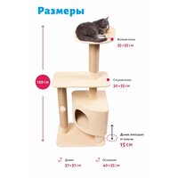 Домик приподнят от пола, учитывая особую любовь кошек к возвышенностям, а наблюдательный пункт на самом верхнем уровне снабжён бортиком, который защищает питомца от падений. Для животных весом до 7 кг.