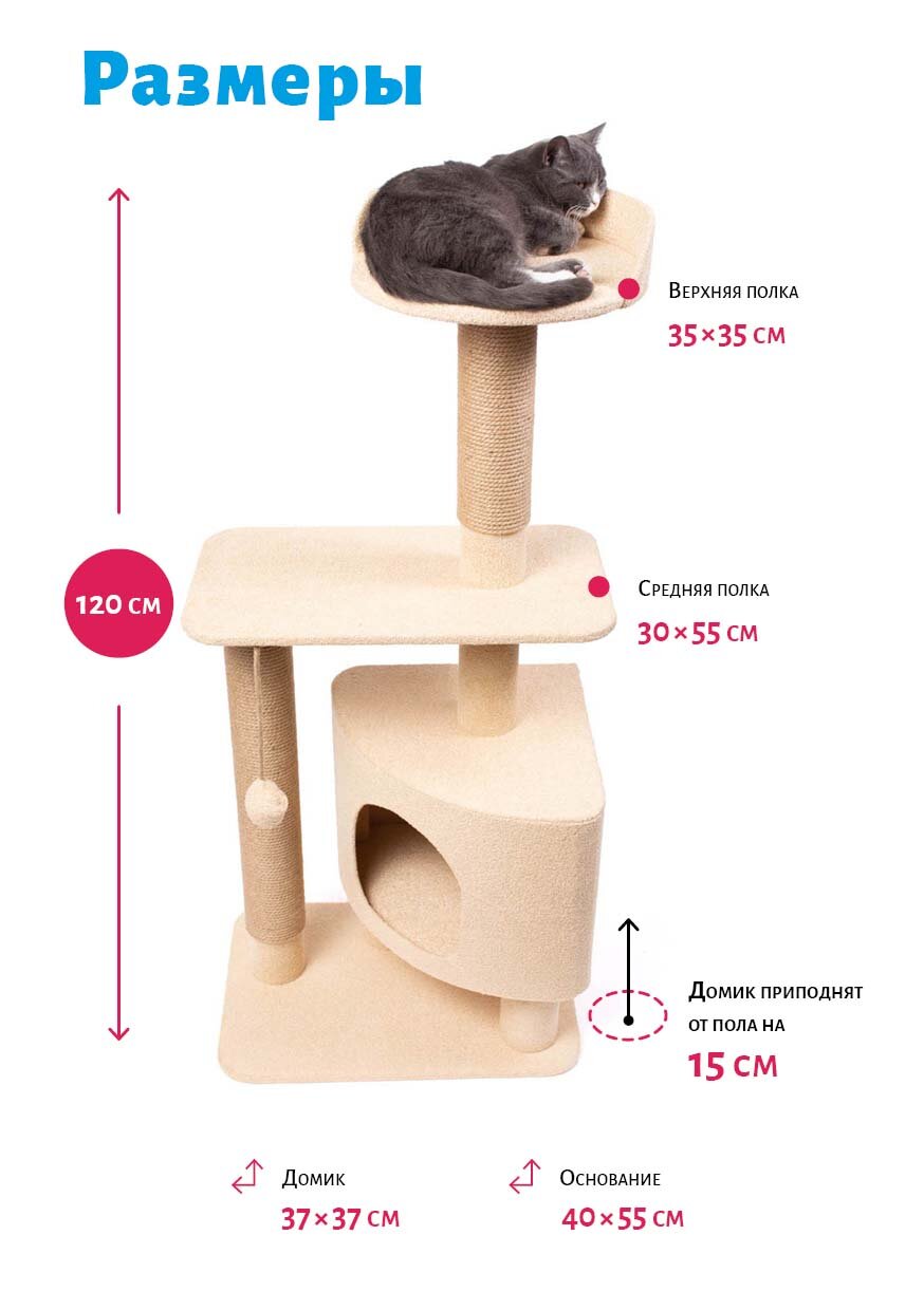 Компактная модель игрового комплекса для кошек при внушительной высоте 120 см. Многоуровневая конструкция позволяет кошке использовать комплекс для игр, отдыха, лазания и гимнастических упражнений. Форма основания, полочки и самого домика даёт возможность идеально вписать домик в угол помещения, что существенно экономит пространство.