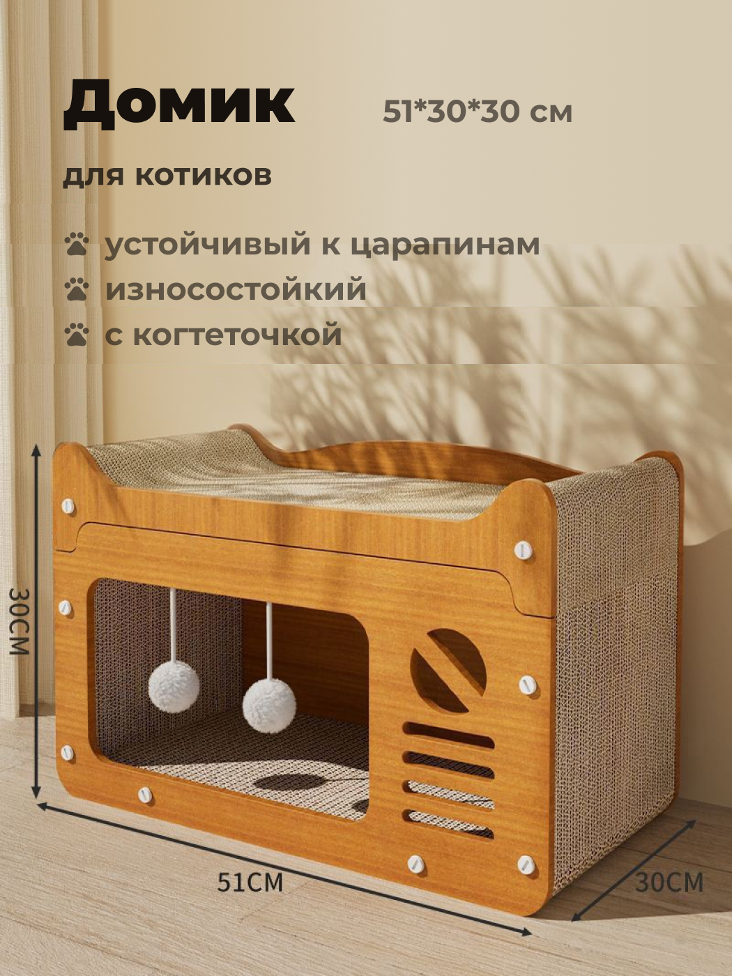 Домик для кошки с когтеточкой и игрушкой - это функциональный и стильный аксессуар для вашего питомца. Размеры домика составляют 30x30x51 см, что позволяет разместить его даже в небольших помещениях.