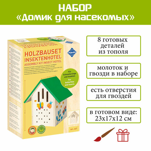 Домик для насекомых Pebaro - это прекрасный набор для создания дома для шмелей, пчел и других насекомых. Комплект включает 8 фанерных деталей с предварительно просверленными отверстиями, стальной молоток, гвозди и инструкцию. Конструкция снабжена промежуточным полом для удобства размещения насекомых. Набор подходит для детей и взрослых, предоставляя возможность совместного творчества и заботу о природе.