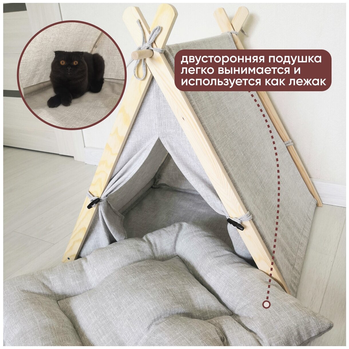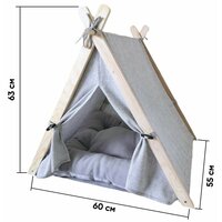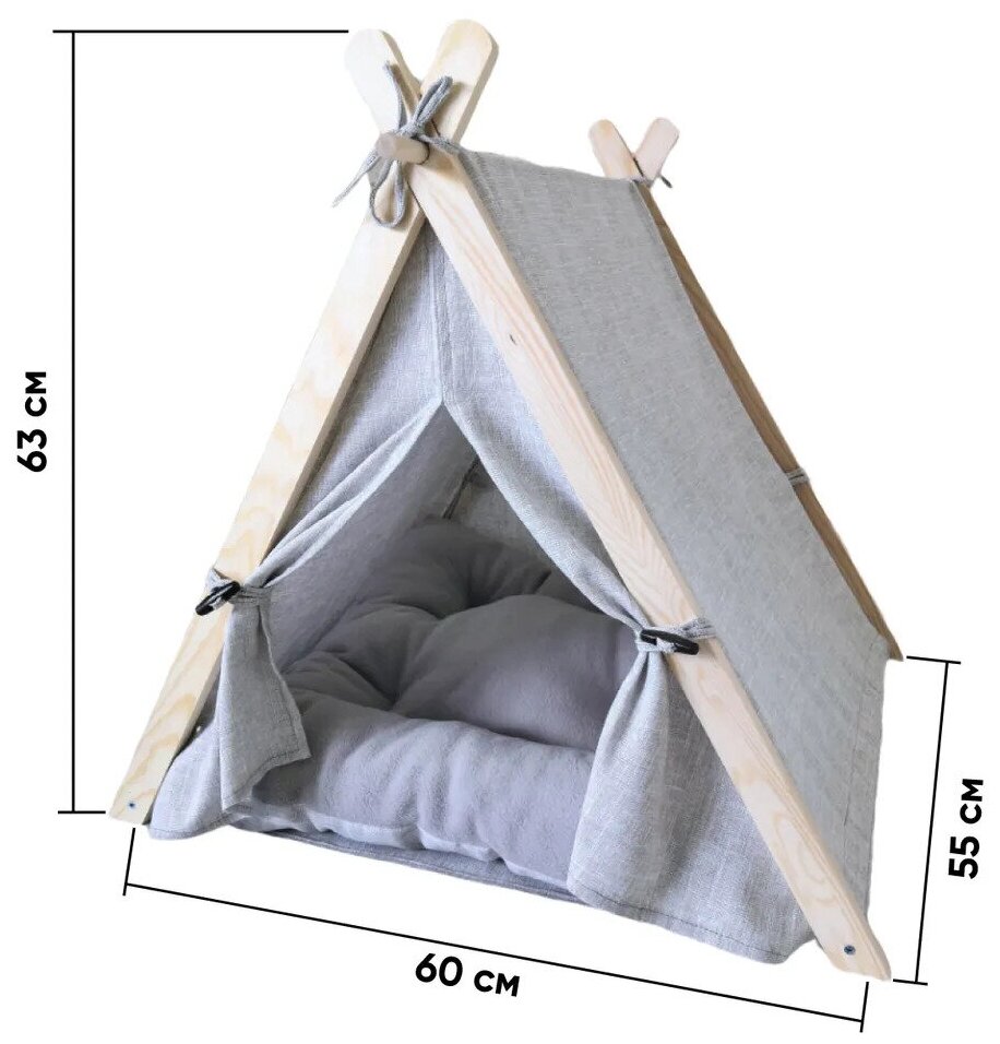 Большой напольный домик палатка для кошки , кота , котят или собаки мелких и средних пород станет уютным местом для отдыха вашего питомца . Палатка изготовлена из натуральных экологически чистых материалов : хлопка и массива дерева . В комплекте с палаткой для комфортного сна идет двусторонняя подушка , которая легко вынимается и ее можно использовать отдельно , как теплый мягкий лежак . Подушка лежанка сшита из надежного материала и набита износостойким волокном . Шалаш выполнен в корейском интерьерном стиле « Королевская изба ». Размеры ДхШхВ: 60х55х63 см. Кошачий домик высокий и просторный , что позволяет вмещать в себя крупных питомцев таких , как Мейн кун . Домик вигвам легко собирается и разбирается неограниченное количество раз . Его можно разобрать , например для перевозки или стирки . Тканевый тент можно стирать в машине на деликатном режиме . Также допускается альтернативное применение : в дрмик можно поставить лоток и использовать его как кошачий туалет . В каждом доме должен быть еще один дом - для любимого питомца . Это его собственный уединенный уголок в котором он сможет спрятаться ото всех . Домик также подходит для следующих животных : кроликов , свинок или любых других мелких и средних домашних животных . Ваш питомец будет в восторге и очень Вам благодарен !