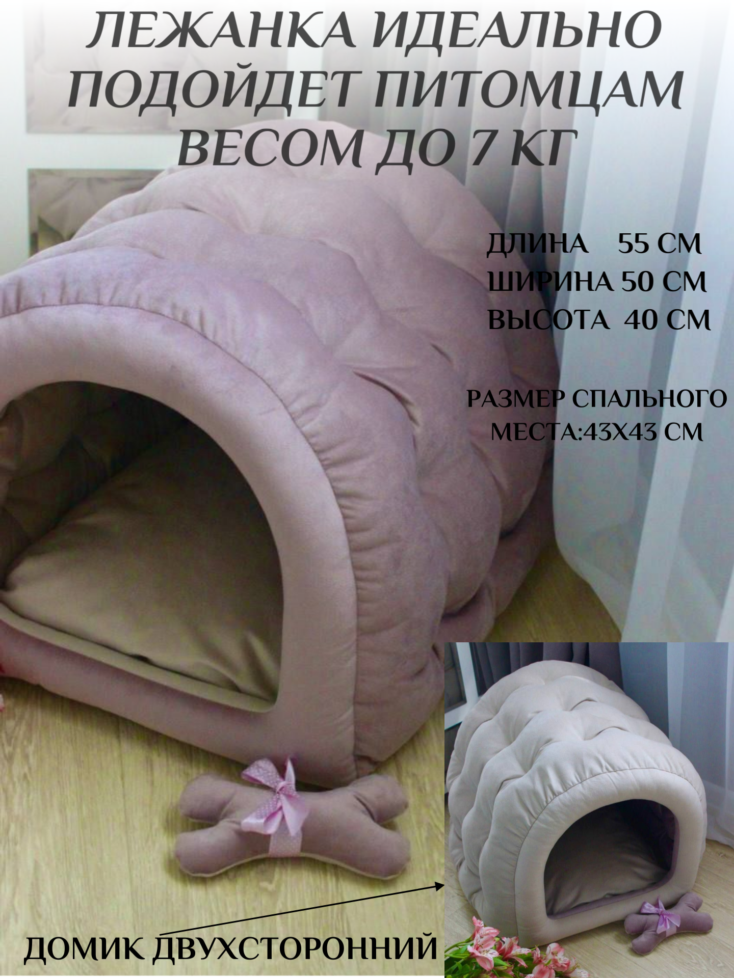 Его внутреннее пространство обеспечивает уют и защищенность для котят или собак небольших размеров. Приятный пудро - розовый оттенок универсален и подойдет к любому интерьеру. Вы можете легко сменить цвет домика - просто отстегните мягкое дно лежанки и вывернуть мягкие бортики наизнанку. Подходит как для сна, так и для спокойного времяпрепровождения домашних животных. Этот дом создан для заботы о вашем пушистом друге!