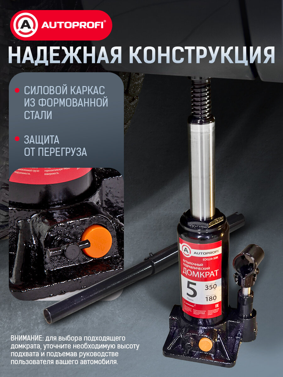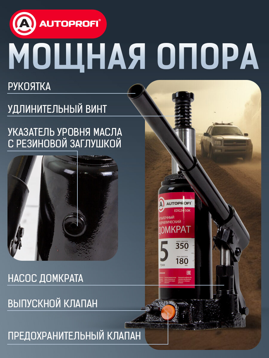 Купить Домкрат AUTOPROFI, бутылочный, гидравлический, грузоподъёмность 5т, черный с доставкой по всей России.