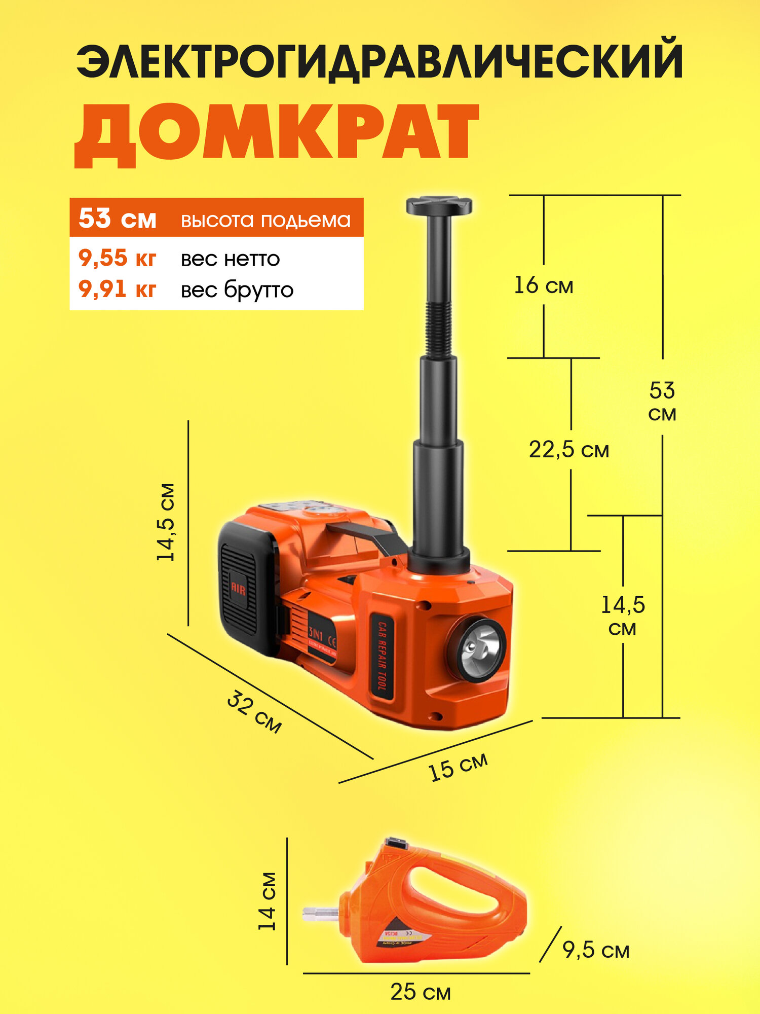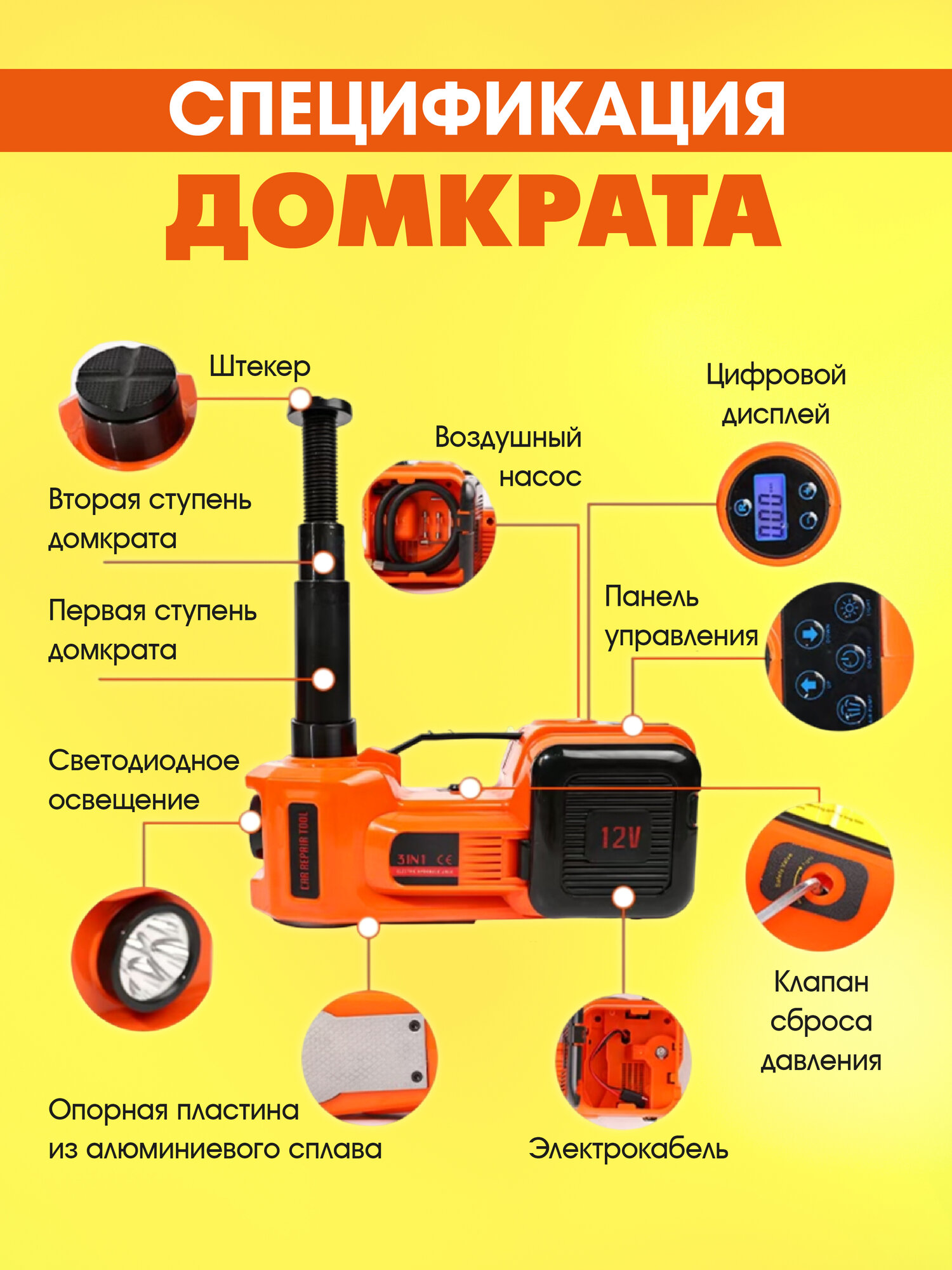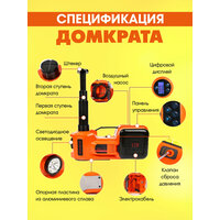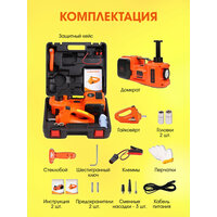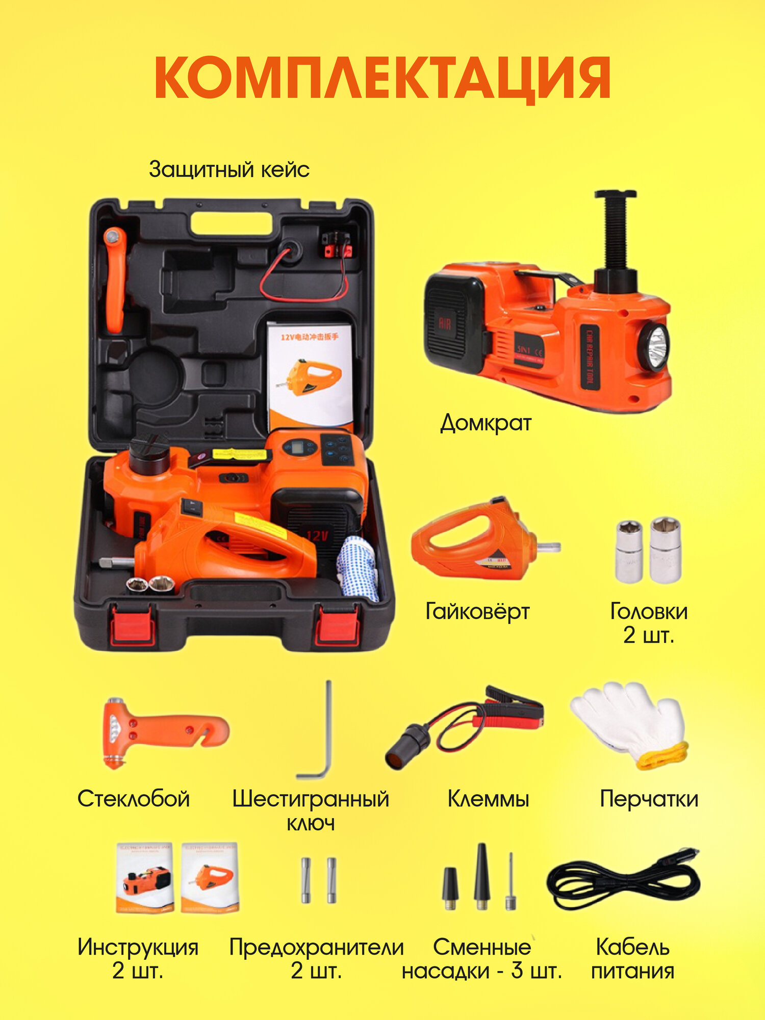 Домкрат автомобильный электрический – многофункциональный комплект для ремонта автомобиля 6 в 1, который идет в специальном чемоданчике с полним набором для замены колес. Набор домкрата включает в себя электрический гидравлический домкрат 6 в 1, электрический гаечный ключ, молоток с набором из двух головок: 17-19 мм, 21-23 мм на 4 размера, шестигранный ключ, удлинитель с зажимом для аккумулятора, кабель питания, перчатки и прочный кейс для хранения. Выдвижной винт позволяет регулировать высоту подъема домкрата, конструкция домкрата обеспечивает долгий срок службы и минимизирует износ. Электрический домкрат позволяет поднимать грузы весом до 5 тонн на высоту 155- 520 мм, что позволяет легко менять колеса на автомобиле или другие ремонтные работы. Мощность автомобильного домкрата 150 Вт, напряжение 12 В, максимальный ток 13 А. Встроенный электрический компрессор позволяет без усилий накачать шины автомобиля. Параметры: максимальное давление накачивания компрессора 10 атм, расход воздуха 65 л/мин, ток 13 А, длина шланга 0,65 м, длина шнура питания – 3,5 м. Электрический гайковерт с набором головок позволит произвести монтаж и демонтаж крепежных соединений с моментом затяжки до 340 Нм. Параметры: мощность электрического гайковерта 100 Вт, напряжение 12 В, максимальный ток 12 А, максимальный крутящий момент 340 н. м. Набор переходников для компрессора и рабочие перчатки в комплекте также делают этот набор универсальным и удобным в использовании. За счет небольшого размера, автодомкрат можно хранить в любом удобном для вас месте (багажник, салон автомобиля, грузовой машины, гаража), также его использование станет намного удобнее по сравнению домкратом подкатным. Все инструменты упакованы в удобный и прочный кейс, который легко помещается в багажнике автомобиля.