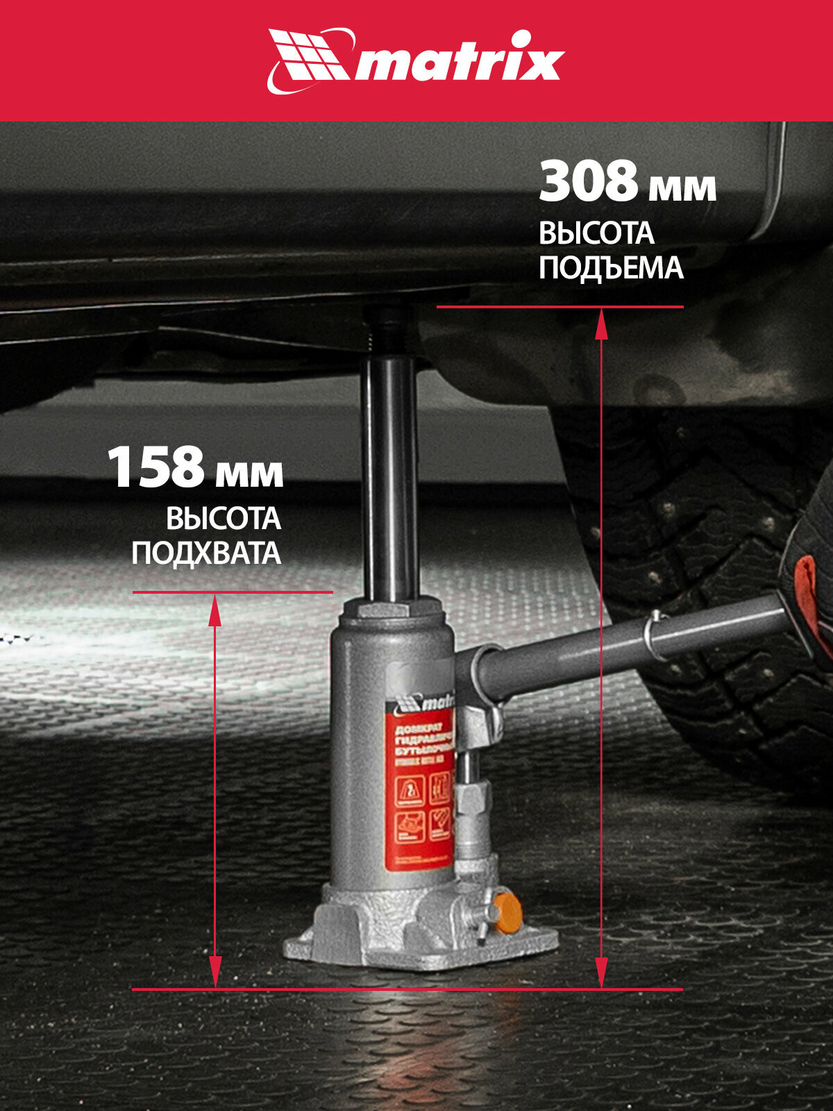 Домкрат автомобильный Matrix 2т, 158-308 мм, защита от перегрузки, гидравлический бутылочный, 50760: сравнение цен, характеристики, фото, актуальное наличие и цены.