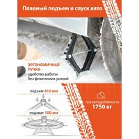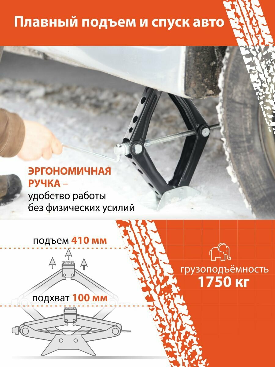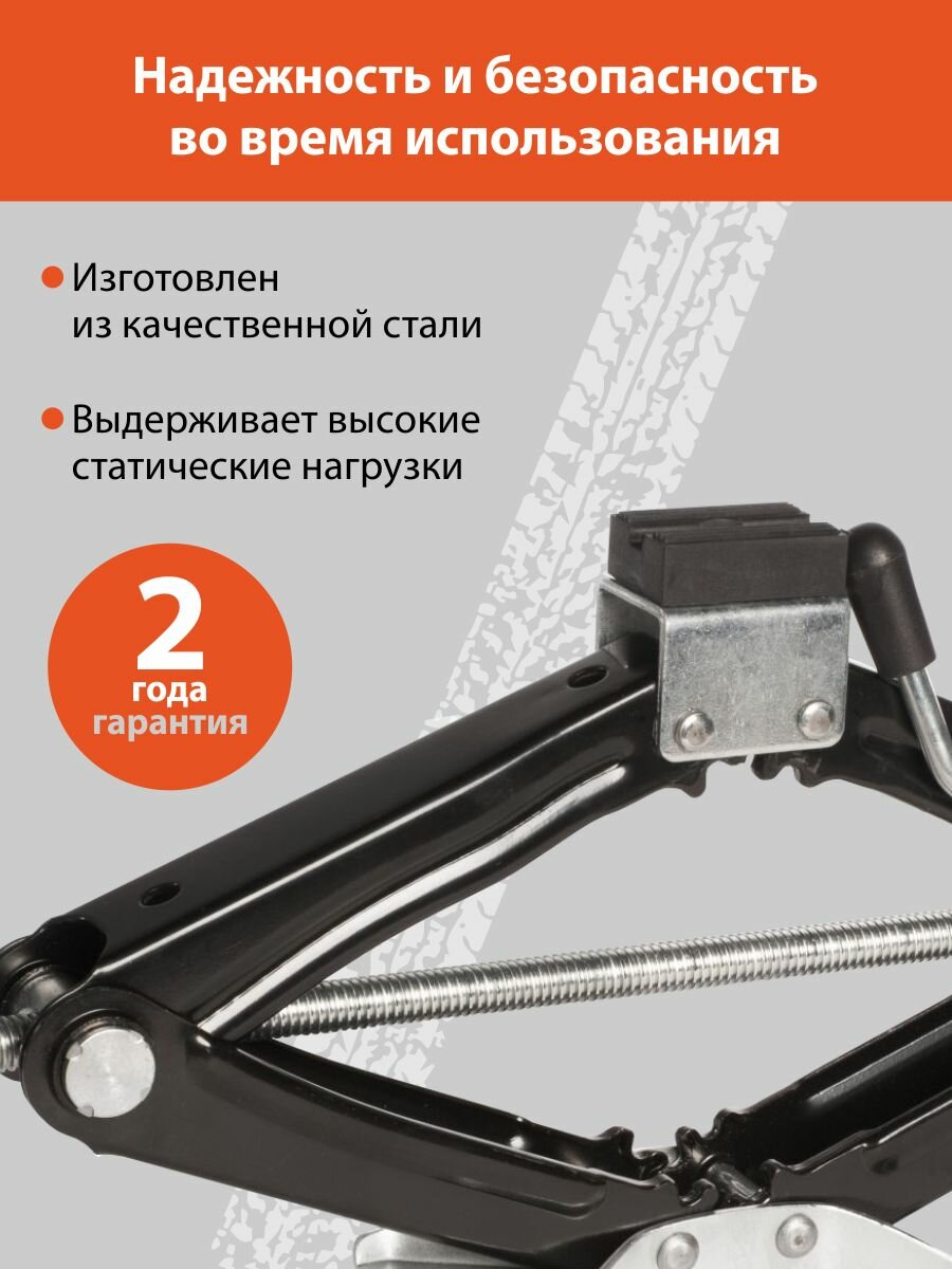 Этот домкрат ромбического типа эффективно поднимает автомобиль, что делает его идеальным решением для замены колёс и мелкого ремонта. Механизм подъёма позволяет легко и быстро поднять машину на необходимую высоту, обеспечивая безопасность и удобство работы. Благодаря своему компактному размеру, он легко помещается в багажнике, что делает его удобным для регулярного использования.