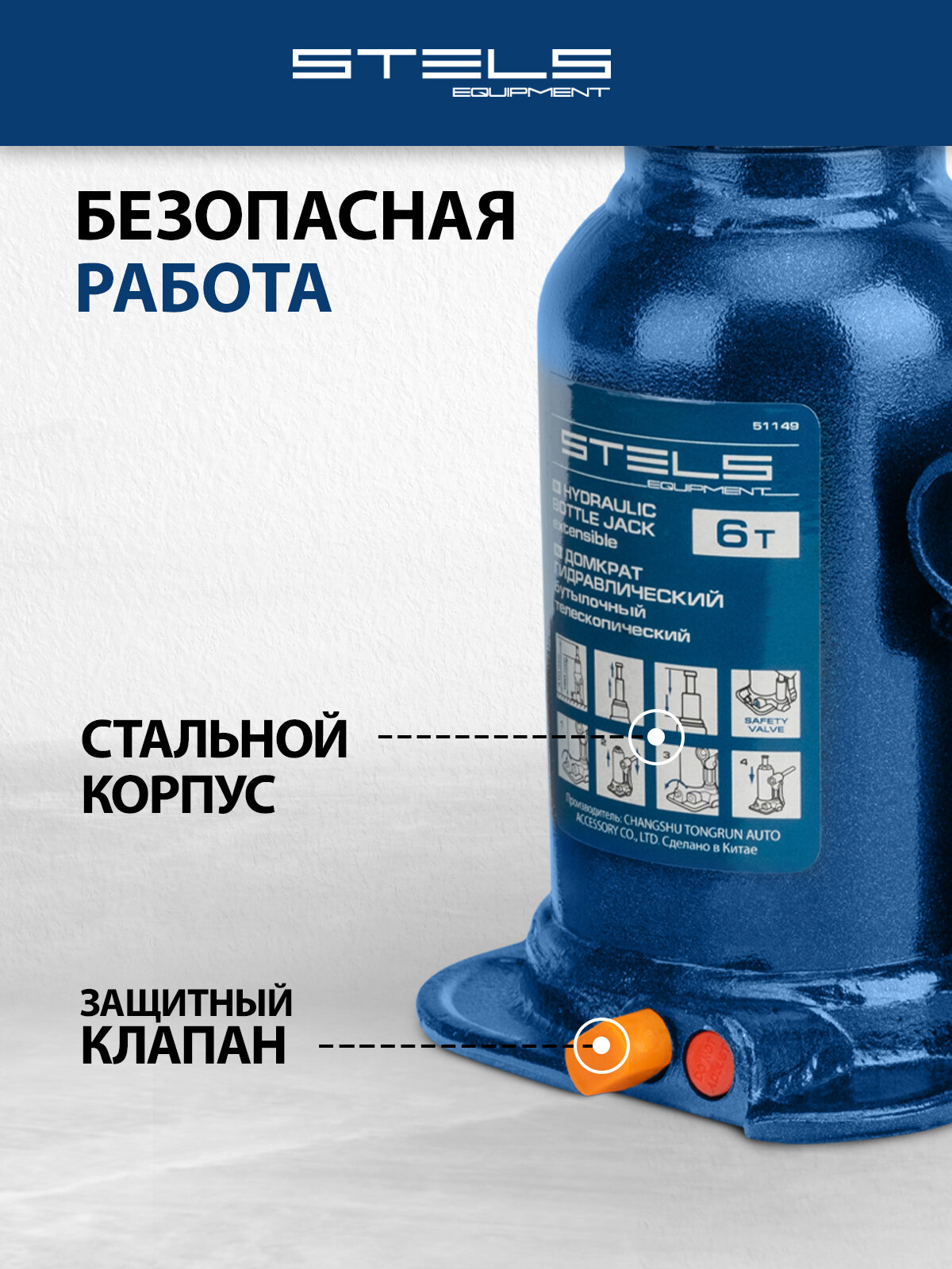 Домкрат автомобильный телескопический Stels 6т, 180-410 мм, защита от перегрузки, гидравлический бутылочный, 51149: сравнение цен, характеристики, фото, актуальное наличие и цены.