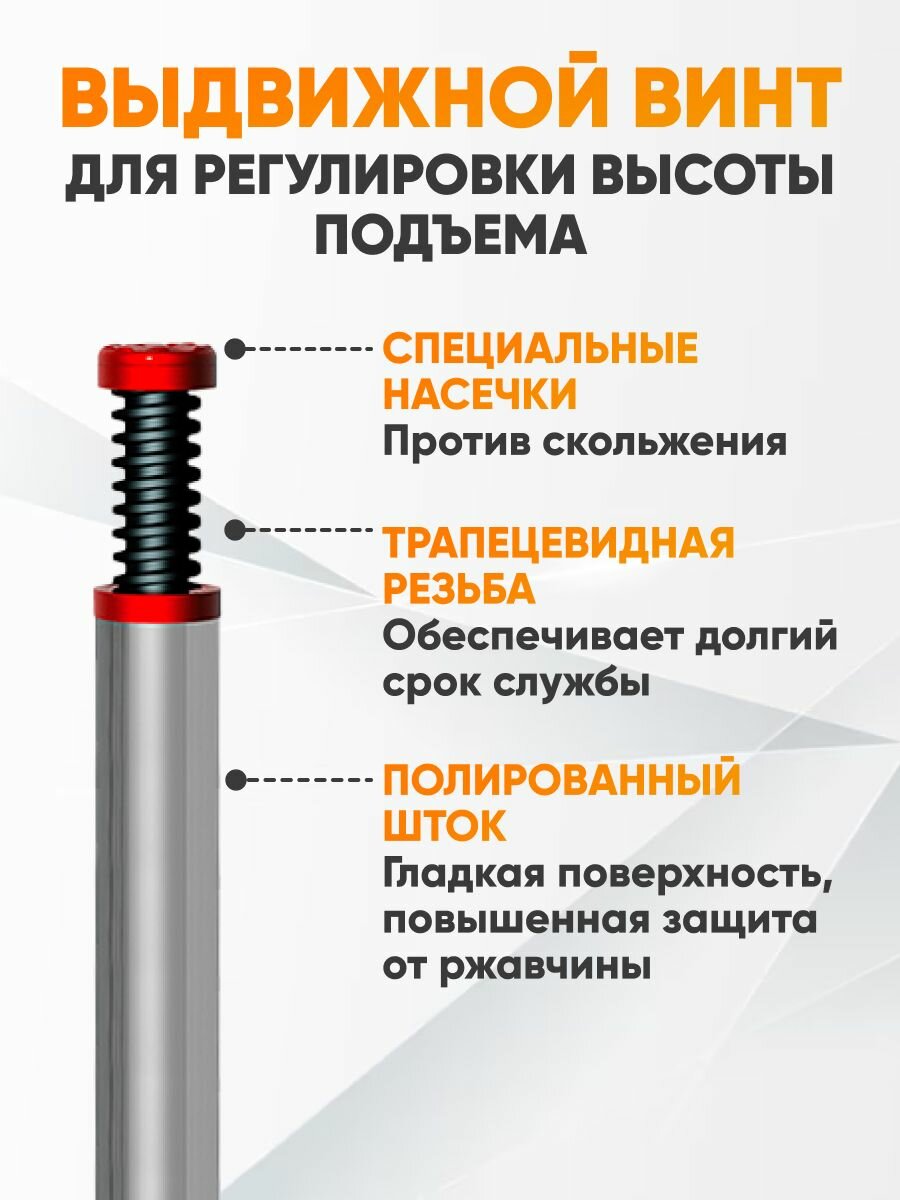 Увеличенный диапазон подъёма делает его универсальным: легко поднимает как легковой автомобиль, так и внедорожник или микроавтобус с высоким клиренсом. Широкое основание обеспечивает устойчивость на любой поверхности, исключая риск опрокидывания или проседания под тяжёлым авто.