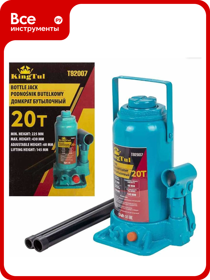 Домкрат бутылочный KingTul 20 т, с клапаном (h min — 225 мм, h max — 430 мм, ход штока — 145 мм, ход винта — 60 мм) KT-T92007(52687): сравнение цен, характеристики, фото, актуальное наличие и цены.