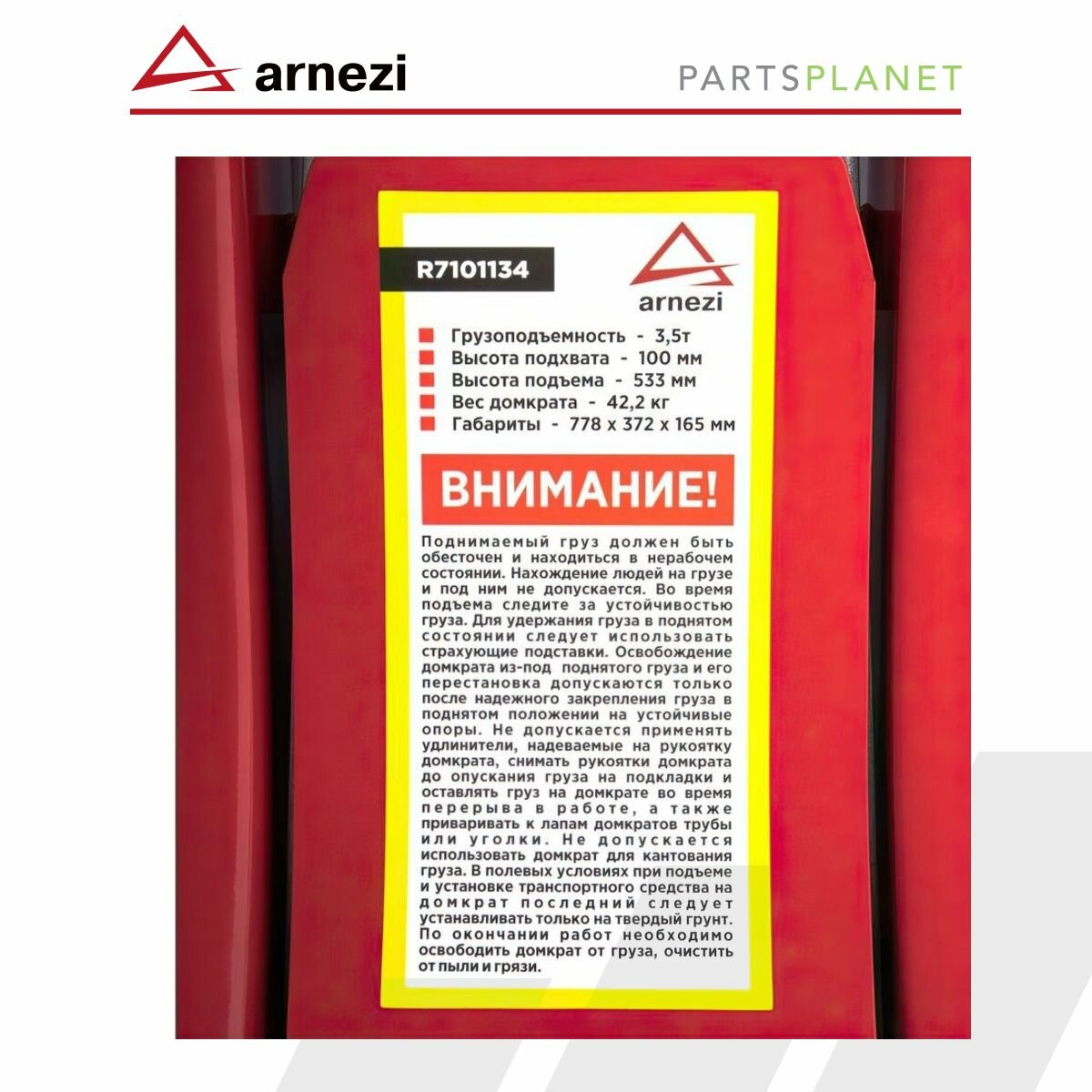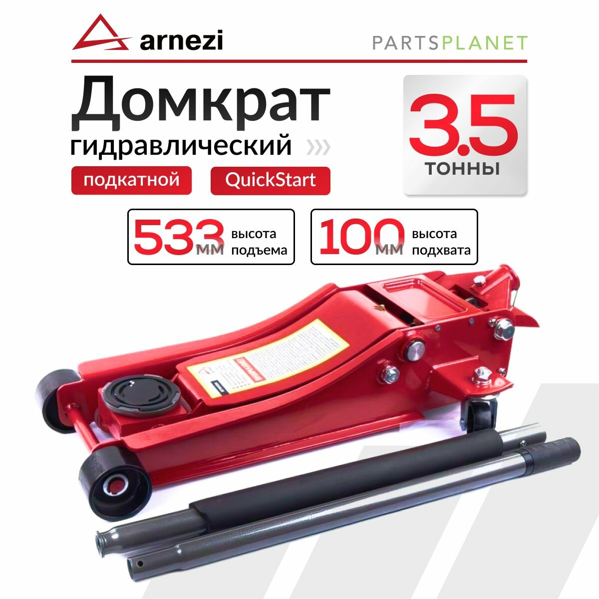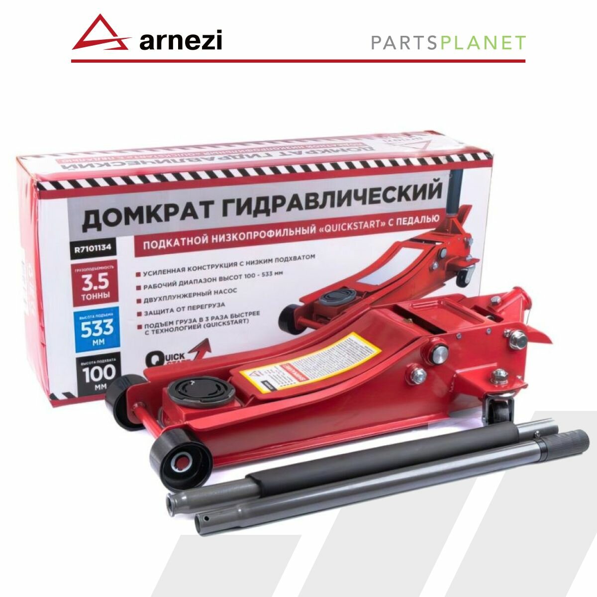 Производитель: ARNEZI Артикул (номер детали): R7101134 Домкрат гидравлический подкатной 3,5т 100-533мм низкопрофильный с педалью (QuickStart) ARNEZI R71011 Свечи, диски, пружины, лампочки - цена за штуку, не за комплект. Шланги, трубки и т. п. цена за метр