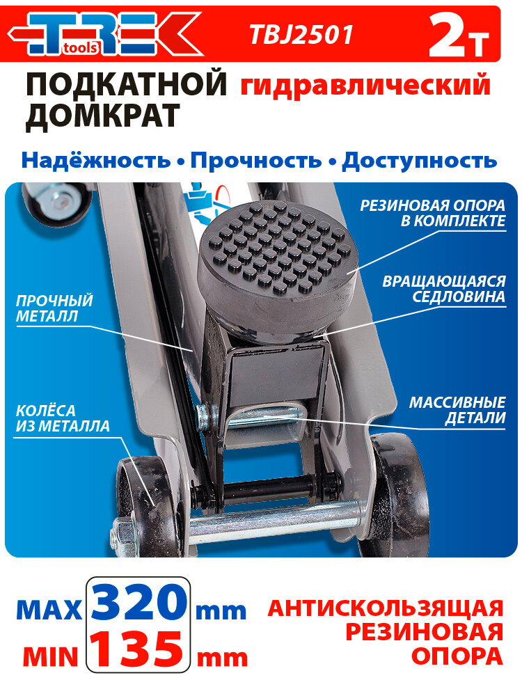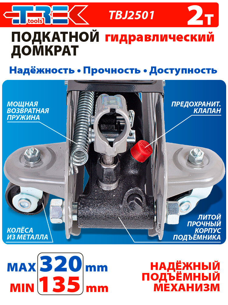 Купить Домкрат подкатной 2т в кейсе (135-320 мм) гидравлический автомобильный 2000кг TREK, TBJ2501 с доставкой по всей России. Домкрат подкатной 2т в кейсе (135-320 мм) гидравлический автомобильный 2000кг TREK, TBJ2501: сравнение цен, характеристики, фото, актуальное наличие и цены.