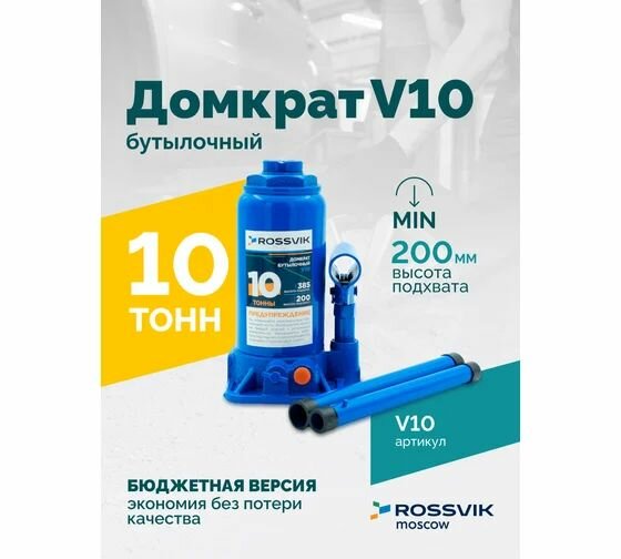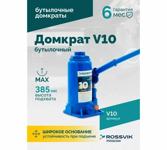 Домкрат Rossvik V10, бутылочный, грузоподъёмность 10т, высота подъёма 385мм: сравнение цен, характеристики, фото, актуальное наличие и цены.