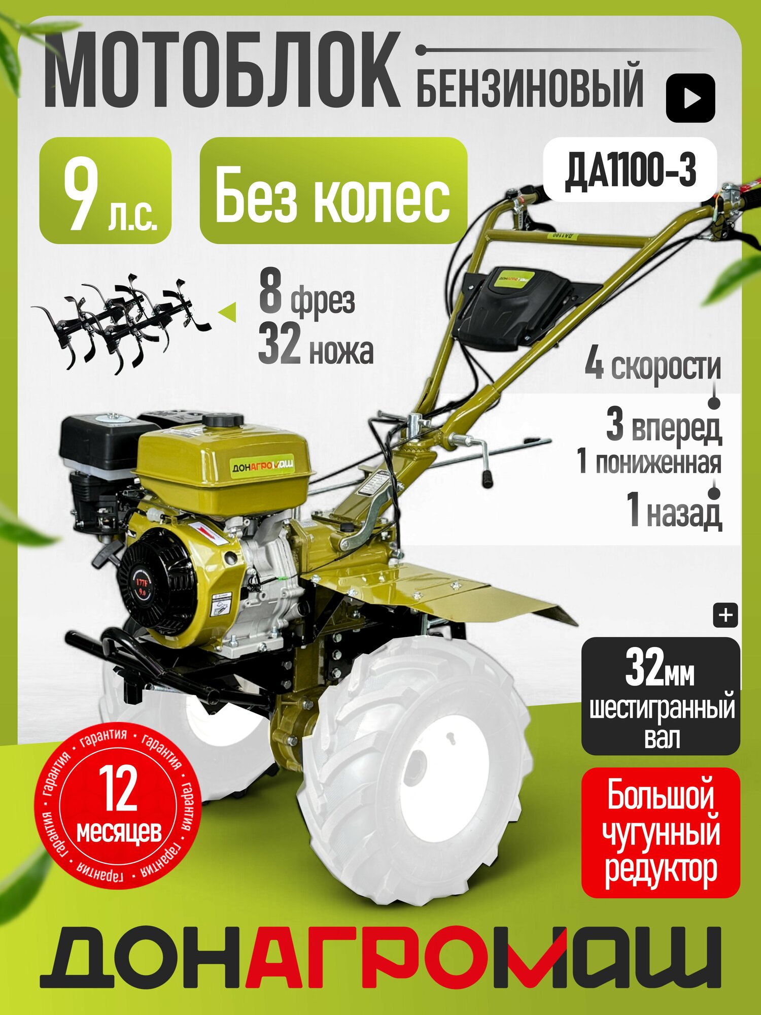 Донагромаш Мотоблок бензиновый редукторный ДА1100-3 (9 л. с, 3 вперед / 1 назад, без колес)