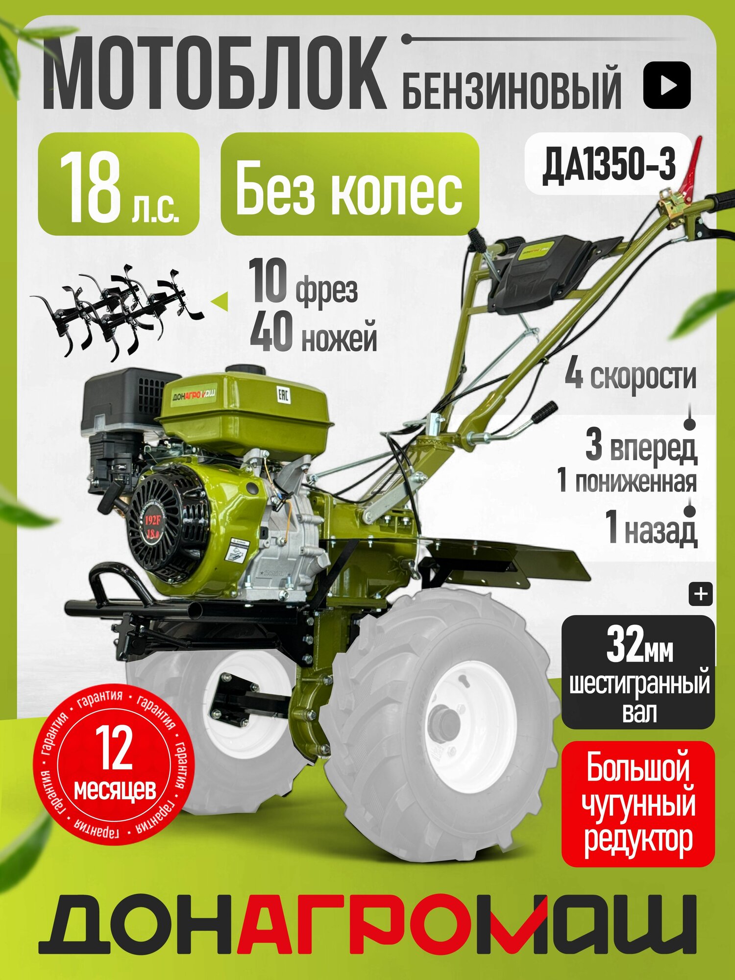 Купить Донагромаш Мотоблок бензиновый редукторный ДА1350-3 (18 л. с, 3 вперед / 1 назад, без колес) с доставкой по всей России.