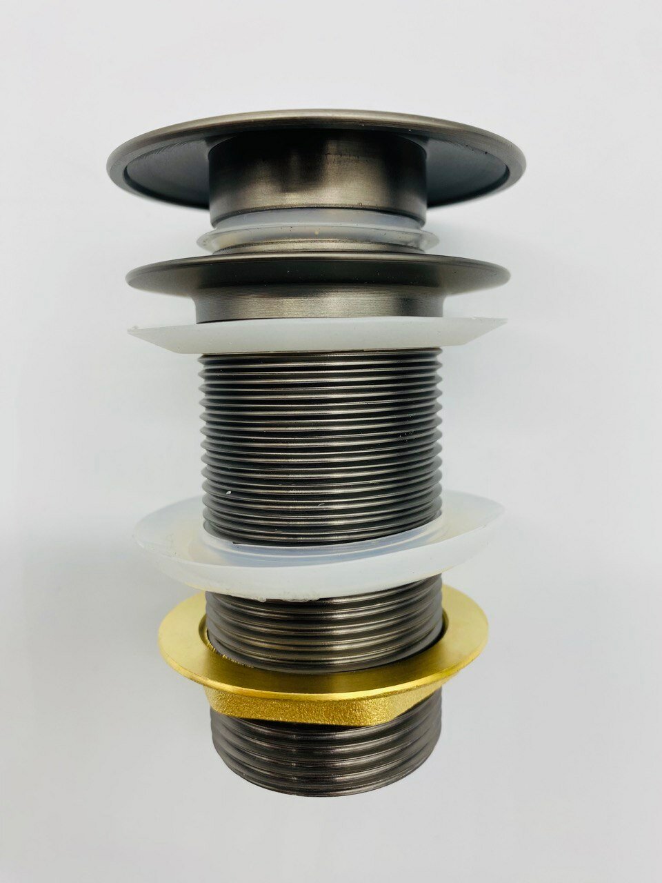 Донный клапан с резьбовым соединением устанавливается в сливное отверстие умывальника или раковины и служит для задержки или спуска необходимого количество воды в емкости. Спуск воды происходит простым нажатием кнопки на клапане. Подходит для пластиковых, стеклянных раковин и для раковин с переливом. Благодаря большой длине корпуса, клапан подходит для большинства раковин. Такие устройства обладают несравненным преимуществом перед остальными, поскольку они страхуют на тот случай, если раковину забыли перекрыть, ненадолго отвлеклись, а напор в это время усилился.