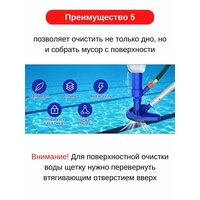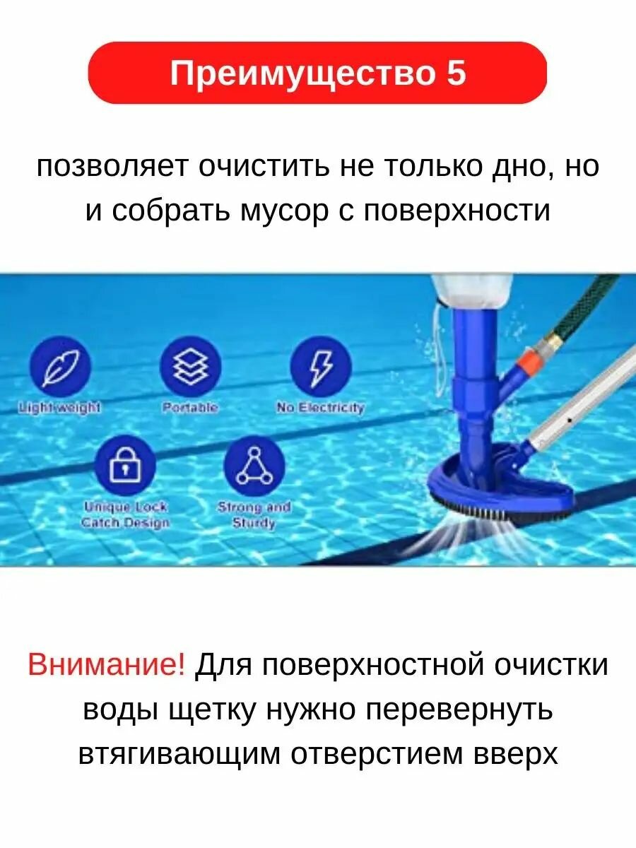 Товарное преимущество 1 Этот пылесос бассейна работает, используя давление воды для создания эффекта всасывания, эффективно втягивая весь мусор из бассейна в его сумку для сбора. Предусмотрено регулярное входное отверстие шланга, позволяющее легко подключить его к садовому шлангу. Это очень эффективно в поддержании чистого и готового бассейна Товарное преимущество 2 удаление пыли, мусора, маленьких игрушек и листьев. Он очень эффективен и идеально подходит для очистки различных типов бассейнов, включая домашние бассейны, бассейны на заднем дворе, надувные бассейны, спа-центры и наземные бассейны. Товарное преимущество 3 Давление воды из вашего садового шланга создает эффект Вентури внутри этого струйного вакуума и производит сильное всасывание в вакуумной головке, вытягивая листья и мусор с пола бассейна в сетчатый мешок вакуума. Насадка для чистки плавательного бассейна*1(Стержень в комплект не входит)Красивые продуктыT674Красивые продукты Спасибо за ваш заказ! Обратите внимание, что срок доставки международных заказов может быть немного дольше обычного. Просим вас запастись терпением – ваш товар обязательно придёт! Мы уверены: нет идеальных товаров, зато есть идеальная служба поддержки! Если возникнут вопросы, обращайтесь к нам в любое время. С уважением ❤