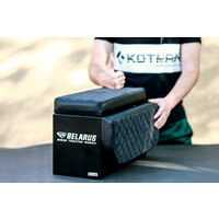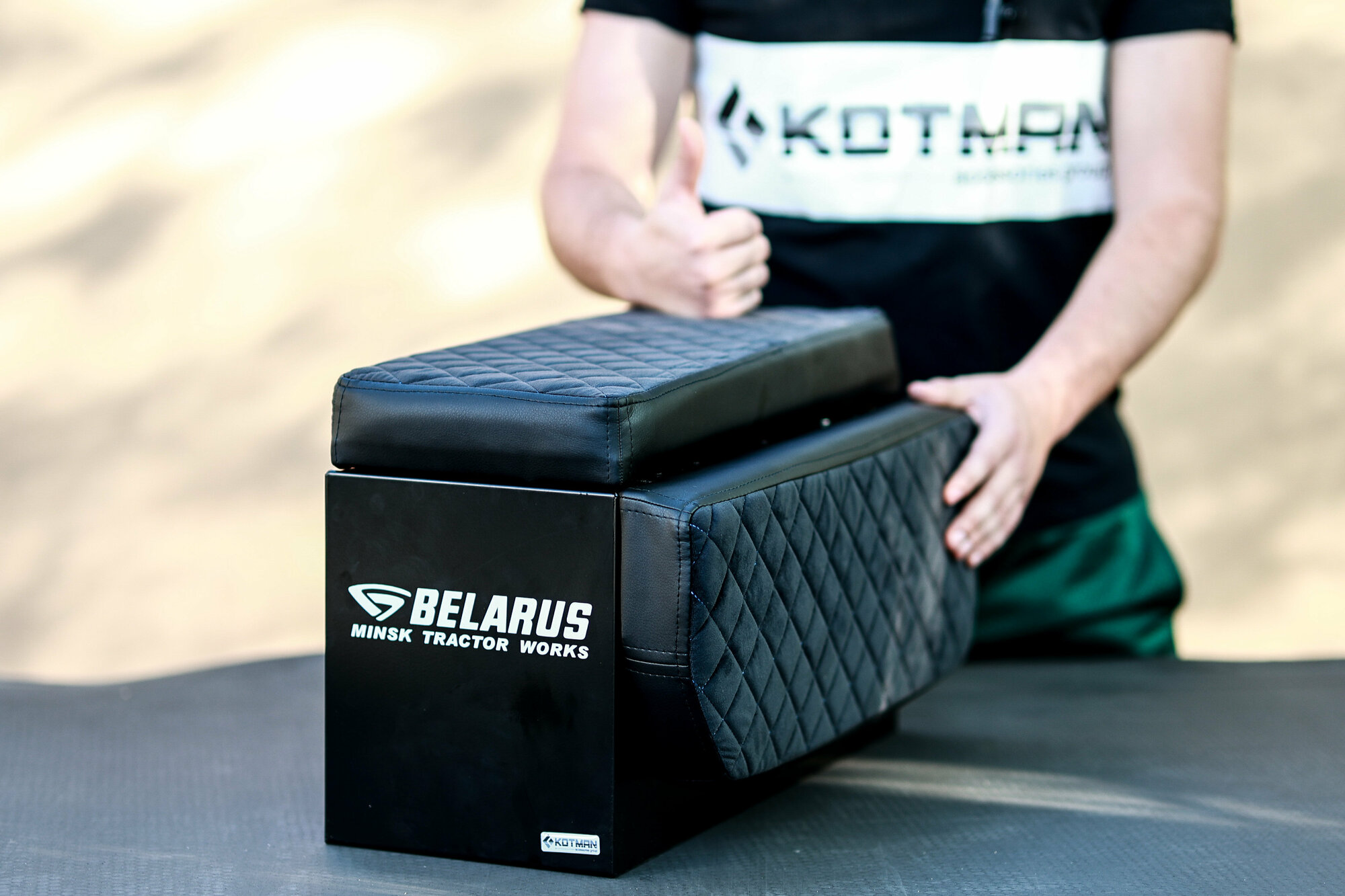 Корпус ящика изготовлен из металла и покрыт порошковой полимерной краской, что увеличивает срок службы. Верхняя часть допсиденья в трактор МТЗ сшита из экокожи по бокам, а сверху сшита из приятной на ощупь и долговечной стёганной алькантары (в синюю строчку).