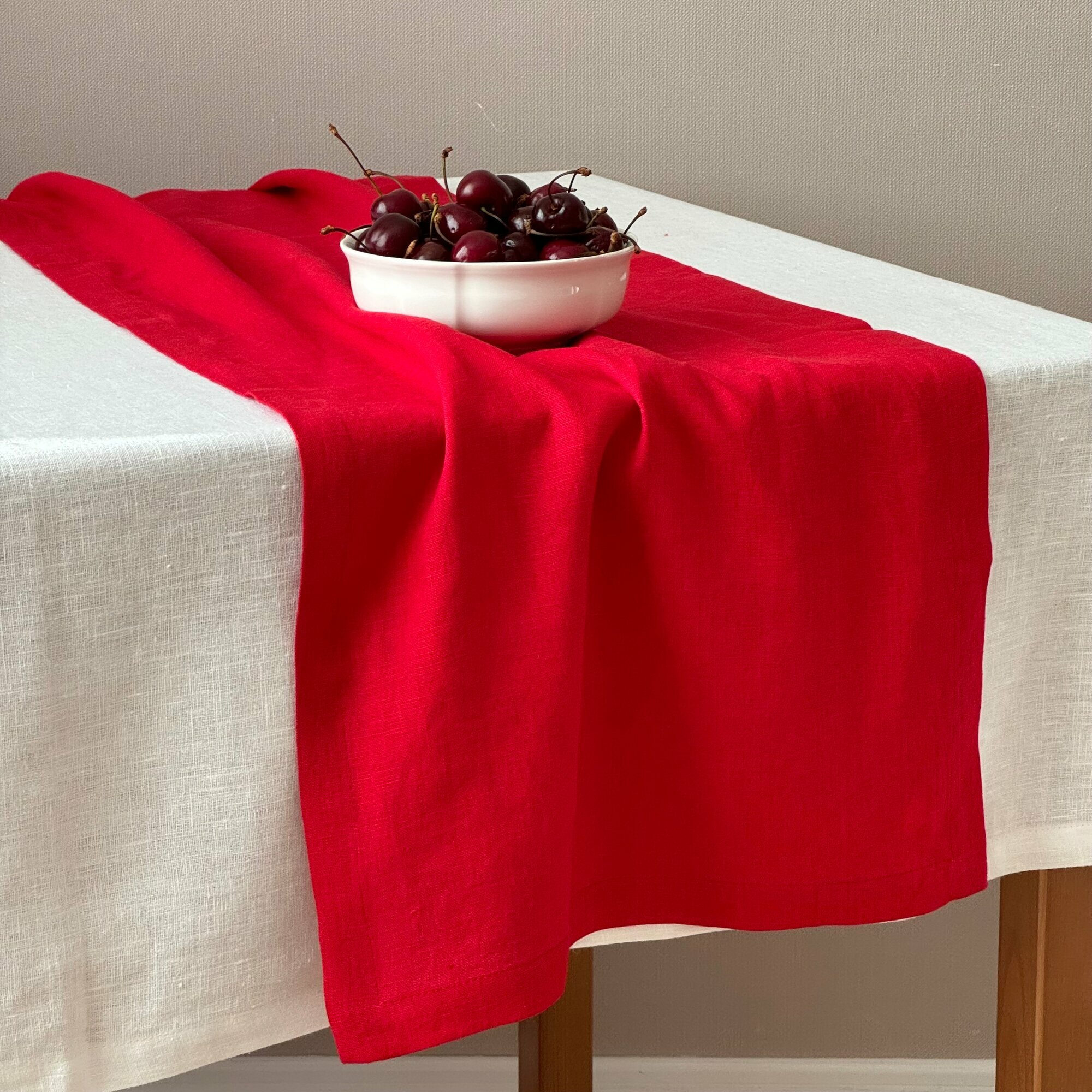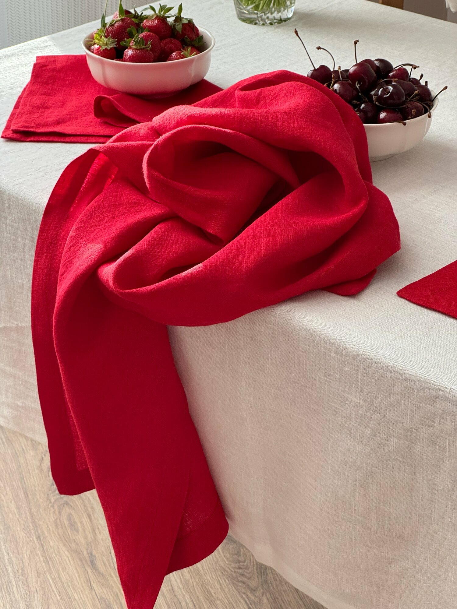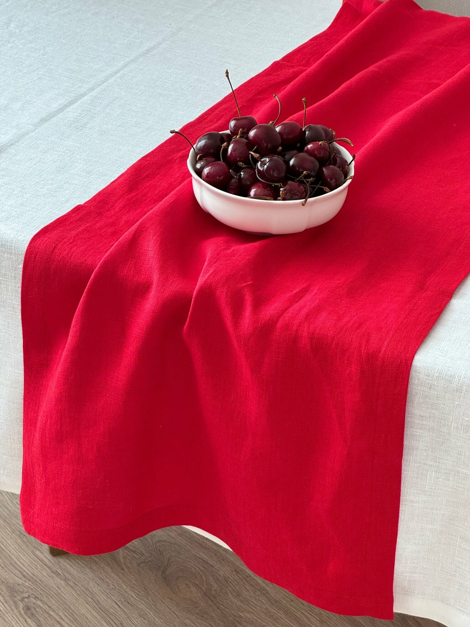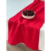 Дорожка на стол из умягченного льна красная для сервировки стола.