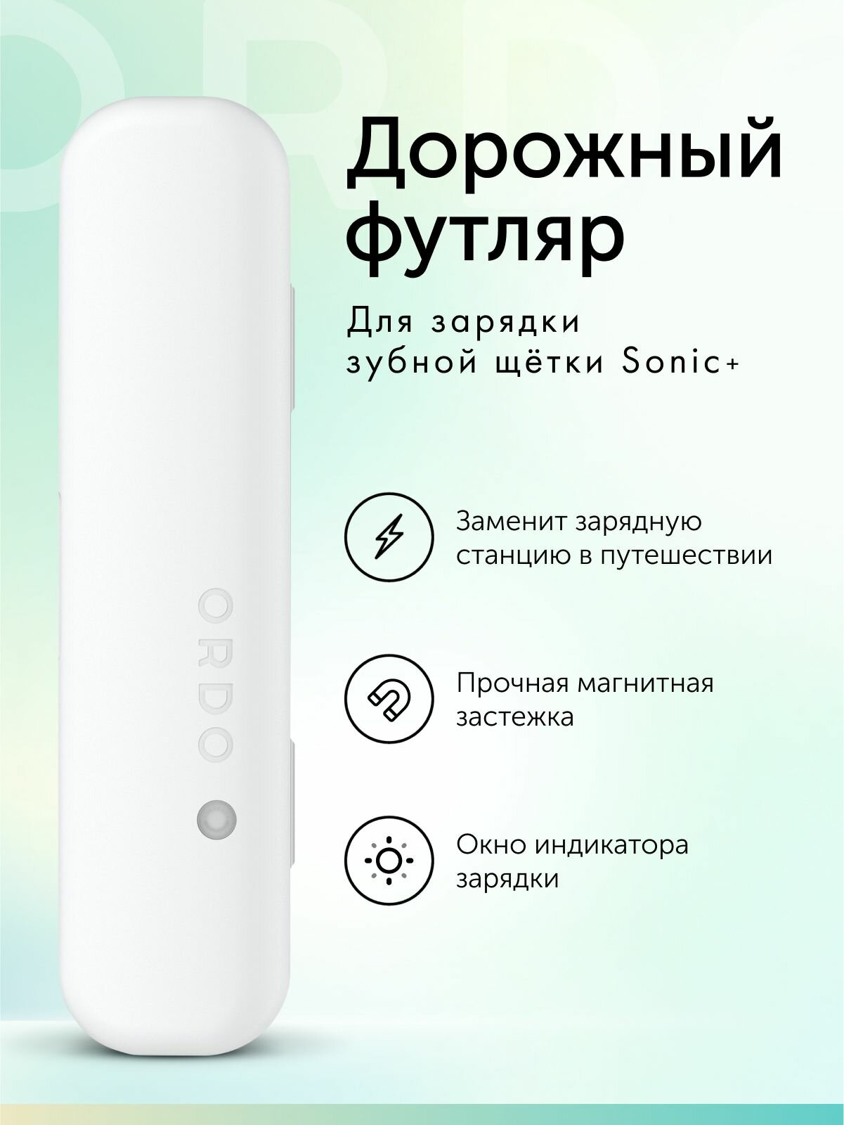 Дорожный футляр для электрической зубной щетки ORDO Sonic+; Вы можете использовать прилагаемый USB-кабель для подключения дорожного футляра к USB-адаптеру, компьютеру или блоку питания; В дорожном футляре есть окошко, через которое можно увидеть индикатор состояния зарядки вашей зубной щетки;