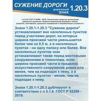 Дорожный знак 1.20.3 Сужение дороги справа I типоразмер Тип светоотражающей плёнки: А Размер 561 х 634 мм Материал основы: оцинкованная сталь Тип крепления: на стойку Комплект: дорожный знак, комплект креплений (4 полухомута, 4 болта, 4 гайки) Упаковка: плотный картон Знаки 1.20.1-1.20.3 "Сужение дороги" устанавливают вне населенных пунктов перед участками дорог, на которых ширина проезжей части уменьшается более чем на 0,5 м, а в населенных пунктах - на одну полосу или более. Вне населенных пунктов знак устанавливают также перед мостовыми сооружениями и тоннелями, если ширина проезжей части в пределах искусственного сооружения равна или менее, чем на подходах к нему, а в населенных пунктах - менее, чем на подходах к нему. Знак 1.20.2 не устанавливают в местах окончания полосы разгона и дополнительной полосы на подъеме. Знаки 1.20.1-1.20.3 дублируют в соответствии с 5.1.6 Основа с двойной отбортовкой и креплением на алюминиевых заклёпках с нанесённой светоотражающей плёнкой методом аппликации. Наше производство сертифицировано по ГОСТ и занимается изготовлением дорожных знаков более 35 лет. Дорожный знак - это важный элемент дорожной инфраструктуры, который помогает регулировать движение автомобилей и обеспечивать безопасность на дорогах. Этот металлический знак со световозвращающим покрытием и отбортовкой устанавливается на дорогах для указания различных правил и ограничений. Дорожные знаки могут быть различных типов: знаки приоритета, предупреждающие, предписывающие, знаки особых предписаний, запрещающие знаки (включая знаки ограничения скорости), информационные, знаки сервиса, знаки дополнительной информации и другие. В нашем каталоге представлены различные товары для организации дорожного движения на дороге, парковке автомобилей или при проведении дорожных работ, включая крепления стальные хомуты, полухомуты. Эти товары предназначены для обеспечения безопасности на дороге и соблюдения ПДД.