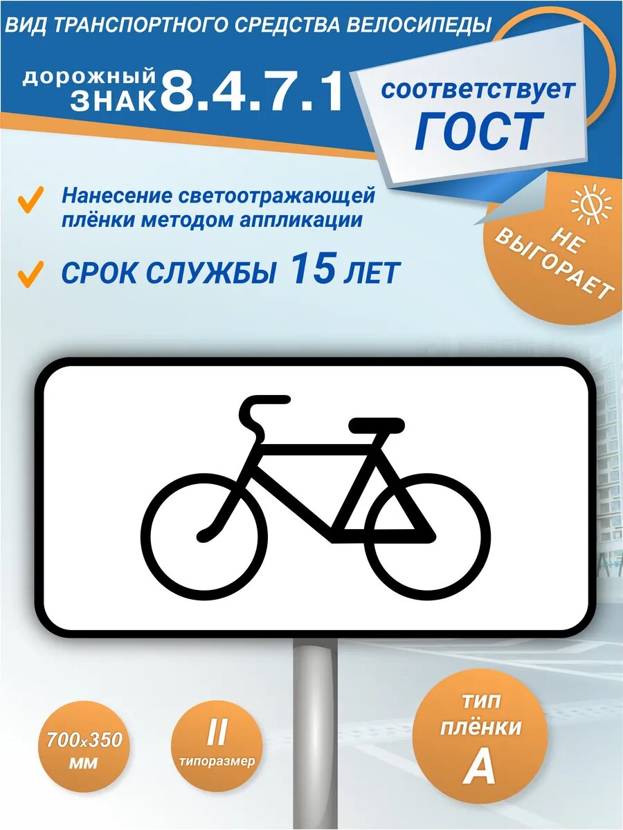 Металлический дорожный знак 8.4.7 .1 Вид транспортного средства II типоразмер Тип светоотражающей плёнки: А Размер 350 х 700 мм Материал основы: оцинкованная сталь Тип крепления: на стойку Комплект: дорожный знак, крепление (2 полухомута, 4 болта, 4 гайки) Упаковка: плотный картон