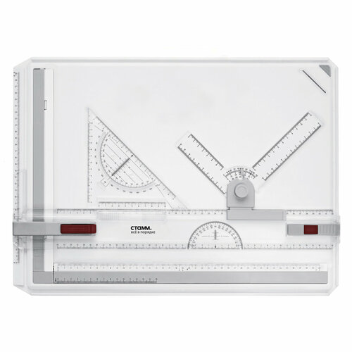 Чертёжная доска (кульман) СТАММ лёгкая в использовании и удобная в транспортировке как для студентов, так и для офисных работников. Товар представлен с рейсшиной, треугольником и набором регулируемых уголков в формате А3 и размером 505*370 мм. Двойные зажимы служат для фиксации чертёжной бумаги на доске, а измерительная линейка удобна при снятии мерок. Пластиковый товар представлен в белом цвете и упакован в картонную коробку. • Вид товара: доска чертёжная (кульман); • Формат: А3; • Цвет: белый; • Материал: пластик; • Размер: 505*370 мм;