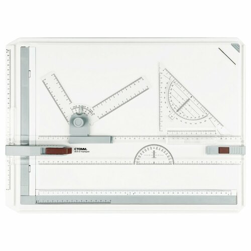 • Доска чертежная формата А3 оснащена всеми необходимыми элементами для комфортного черчения. В комплект входит рейсшина, треугольник и набор регулируемых уголков, которые помогут вам точно и аккуратно выполнять чертежи. Двойные зажимы надежно фиксируют бумагу на поверхности доски, обеспечивая стабильность работы.