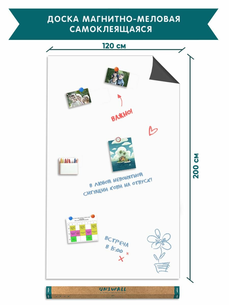 Гибкая Самоклеящееся магнитная доска UNIWALL в рулоне - это лучший выбор для тех, кто ищет практичное и стильное решение для рисования и обучения. Размер доски 120х200 см Для магнитно-маркерных досок юнивол необходимо использовать маркеры для белых досок, неодимовые или легкие магниты с полностью магнитным оборотом. Некачественные и слабые магниты могут соскальзывать с магнитной доски. Доска для рисования юнивал изготовлена из высококачественного матового полипропилена, металлизированных слоев и самоклеящейся основы. Она не царапается, имеет антибликовое покрытие и водоотталкивающие свойства, функциональней и эффективней чем доска в раме, не дребезжит при использовании. Стильно смотреться в современных офисах и школах. Инструкция по монтажу 1. Выберите ровную, гладкую поверхность. 2. Очистите поверхность от пыли. 3. Заранее защитную пленку не снимайте, снимайте ее только перед монтажом не более чем на 10 см. Затем постепенно снимая защитную пленку, постепенно раскатывайте магнитную доску по стене. Рекомендуется тщательно прикатать всю доску пластиковым шпателем, особое внимание уделите краям доски. Создавайте свой идеальный офис или класс без усилий – наш бренд предлагает самые качественные наборы для офиса и школы, которые включают в себя доски для рисования маркером, школьные доски, магнитные доски и доски для рисования с магнитными игрушками. Для тех, кто ищет стильные и практичные элементы декора – мы предлагаем широкий ассортимент досок настенных, досок для рисования, а также магнитно-маркерных, магнитных пленок и досок, которые точно подойдут для любого интерьера. Магнитная доска - идеальный подарок для детей, коллеги или родственников на 8 марта и 23 февраля. Подарок на день рождения мальчику и девочке, подарок на новый год, новогодние игрушки Самоклеящаяся основа клеится одной полосой, встык клеить нельзя (если вы хотите поклеить всю стену целиком или несколько полос встык используйте обои UNIWALL на бумажной основе