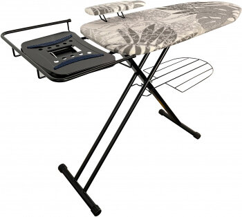 Каркас доски выполнен из металла, он выдерживает до 25 кг веса. Его высота плавно подстраивается под любой рост. Вплоть до того, что работать на аксессуаре можно как стоя, так и сидя, если процесс затягивается. Помимо рабочей поверхности, у гладильной доски есть встроенные розетка и удлинитель, они помогают обезопасить дом от растянутых проводов, полка для белья, металлическая подставка для утюга и специальный рукав для разглаживания манжетов, рукавов, воротников, платьев и водолазок.