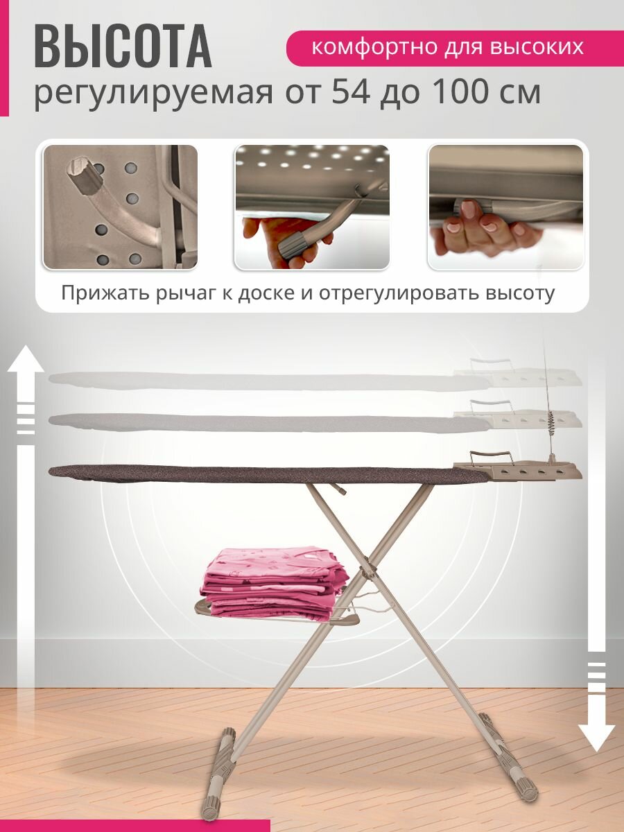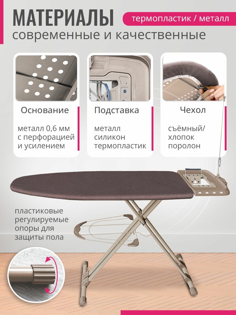 Гладильная доска Ника Валенсия 1. Доска гладильная металлическая с плавной регулировкой по высоте до 1 метра, с подставкой под утюг или парогенератор. Широкая подставка под утюг и парогенератор. Съемный чехол изготовлен из поролона и хлопка. Электросоединитель 1,9 м. Кронштейн для провода утюга. Розетка с держателем для провода утюга. Полка для белья. Габаритные размеры: гладильная поверхность (Д х Ш) - 123,5 х 46 см; В сложенном виде (Д х Ш х В) - 163 х 46 х 8 см; Вес - 9,8 кг. Глажка. Доска гладильная металлическая.