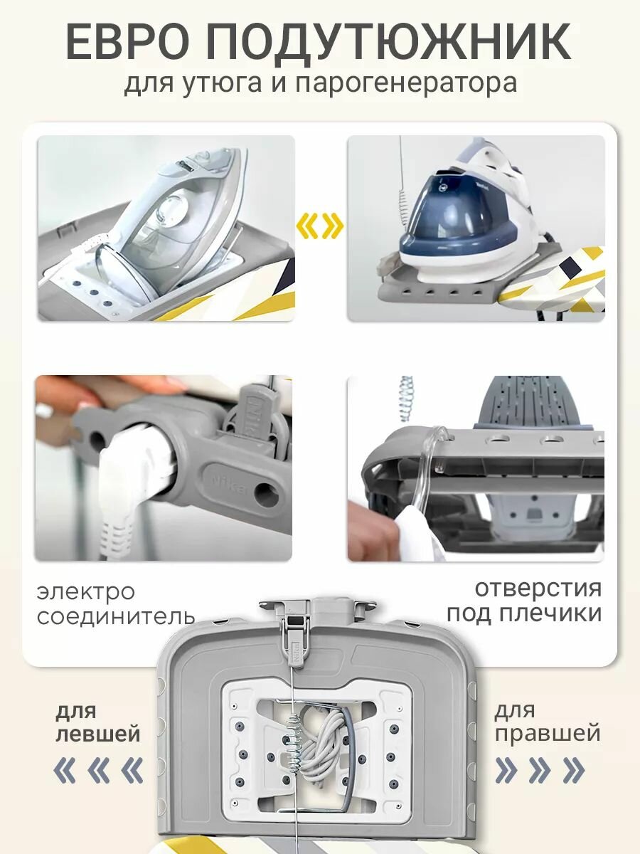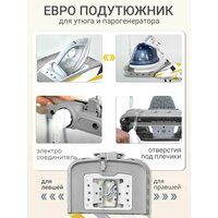 встроенная розетка для утюга, гладильный рукав, кронштейн для провода, подставка для парогенератора, подставка для утюга, полка для белья, удлинитель