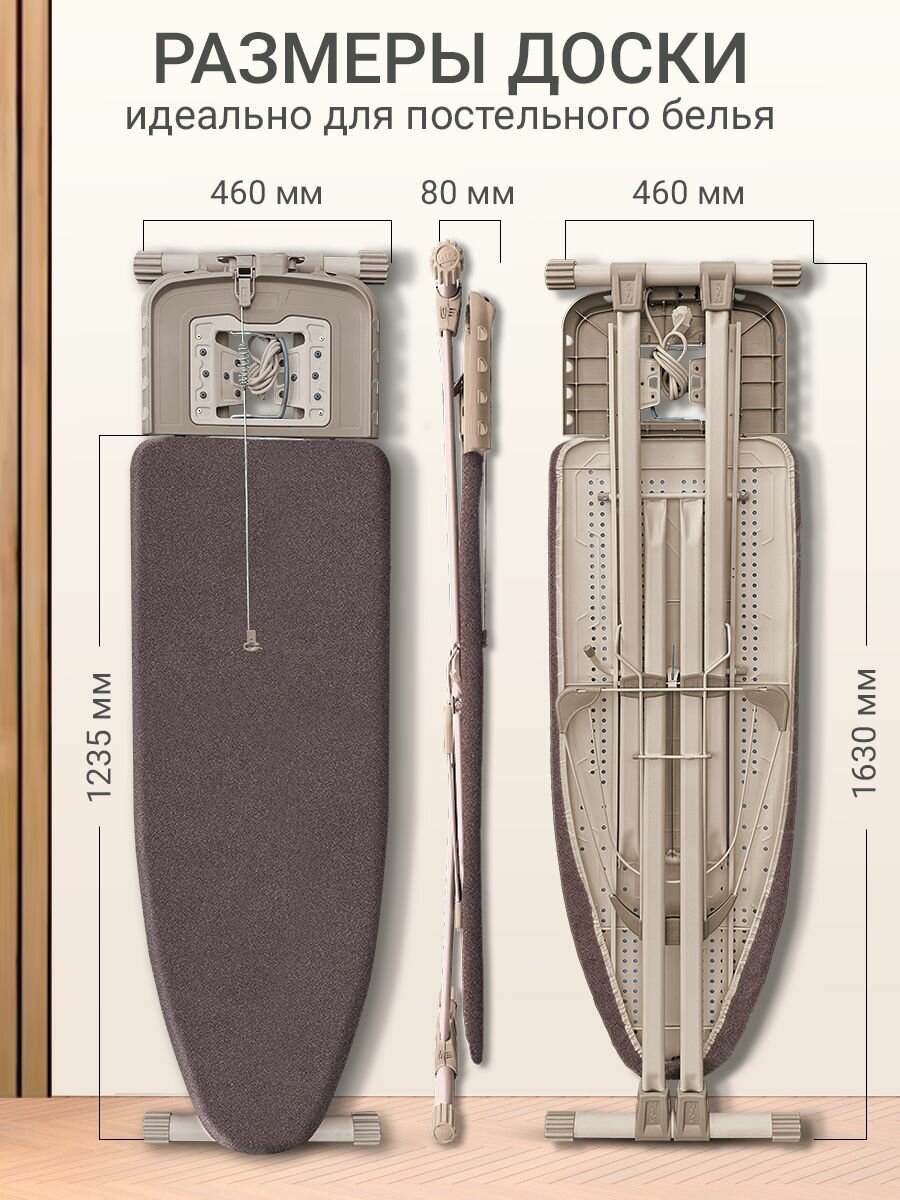 встроенная розетка для утюга, гладильный рукав, кронштейн для провода, подставка для парогенератора, подставка для утюга, полка для белья, удлинитель