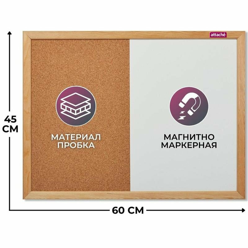 Доска для информации Attache Combo комбинированная пробковая/магнитно — маркерная. Материал покрытия: половина доски — натуральная пробка, другая половина — сталь с белым лаковым покрытием. Толщина пробки 1 мм, толщина металлического листа 0,3 мм. Обратная сторона доски выполнена из ДВП панели толщиной 8 мм. Ширина профиля рамы из высококачественной древесины 25 мм. Навесной крепеж и инструкция по установке в комплекте, крепление к стене в двух точках. Расположение горизонтальное/ вертикальное. Документы, объявления, записки и фотографии легко крепятся на пробковой части при помощи силовых кнопок, а на магнитно — маркерной — при помощи магнитов. Для надписей на магнитно — маркерной части используются whiteboard маркеры для досок сухого стирания. Удаляются надписи с помощью специальных губок и салфеток для досок. Страна-производитель &