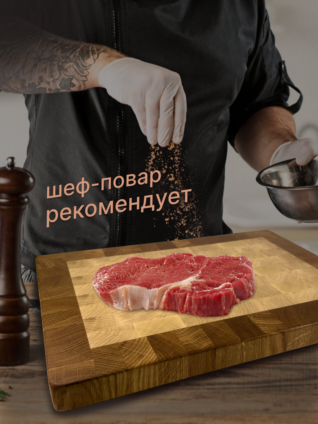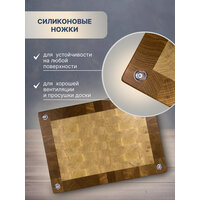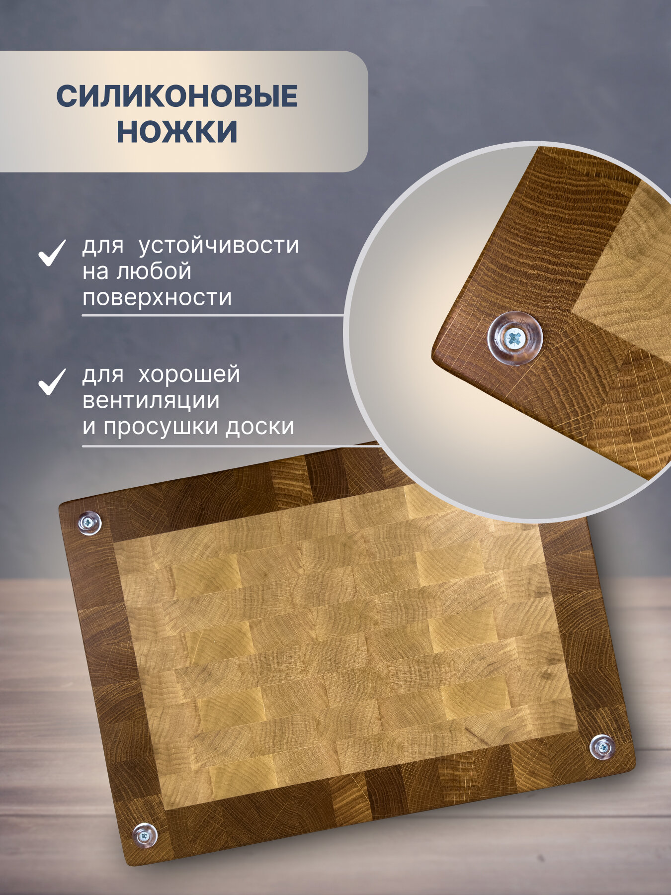 Торцевая разделочная доска выполнена из качественного дерева, пропитана минеральным маслом и покрыта воском. Обладает повышенной прочностью, экологичная, натуральная. Доска оснащена силиконовыми противоскользящими ножками, они способствуют хорошему проветриванию и защите от излишнего намокания. Доска может использоваться для резки продуктов, и для подачи и сервировки мяса, рыбы, сыра, пиццы, бургеров. Украсит вашу кухню и дом. Порадует вас на пикнике, барбекю. Время от времени смазывайте доску минеральным маслом, можно использовать смесь минерального масла с добавлением пчелиного воска (5/1). Нельзя мыть в посудомоечной машине и замачивать в воде. После мытья протирать сухим полотенцем. Избегать перепадов температур, хранить вдали от нагревательных приборов. Такие доски любят профессиональные повара и рестораны и кафе для красивой подачи блюд. Надеемся для вас это будет полезным и удобным приобретением. Все изделия сделаны вручную, рисунок, цвет, размер каждой доски может немного отличаться.