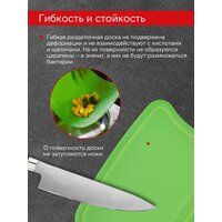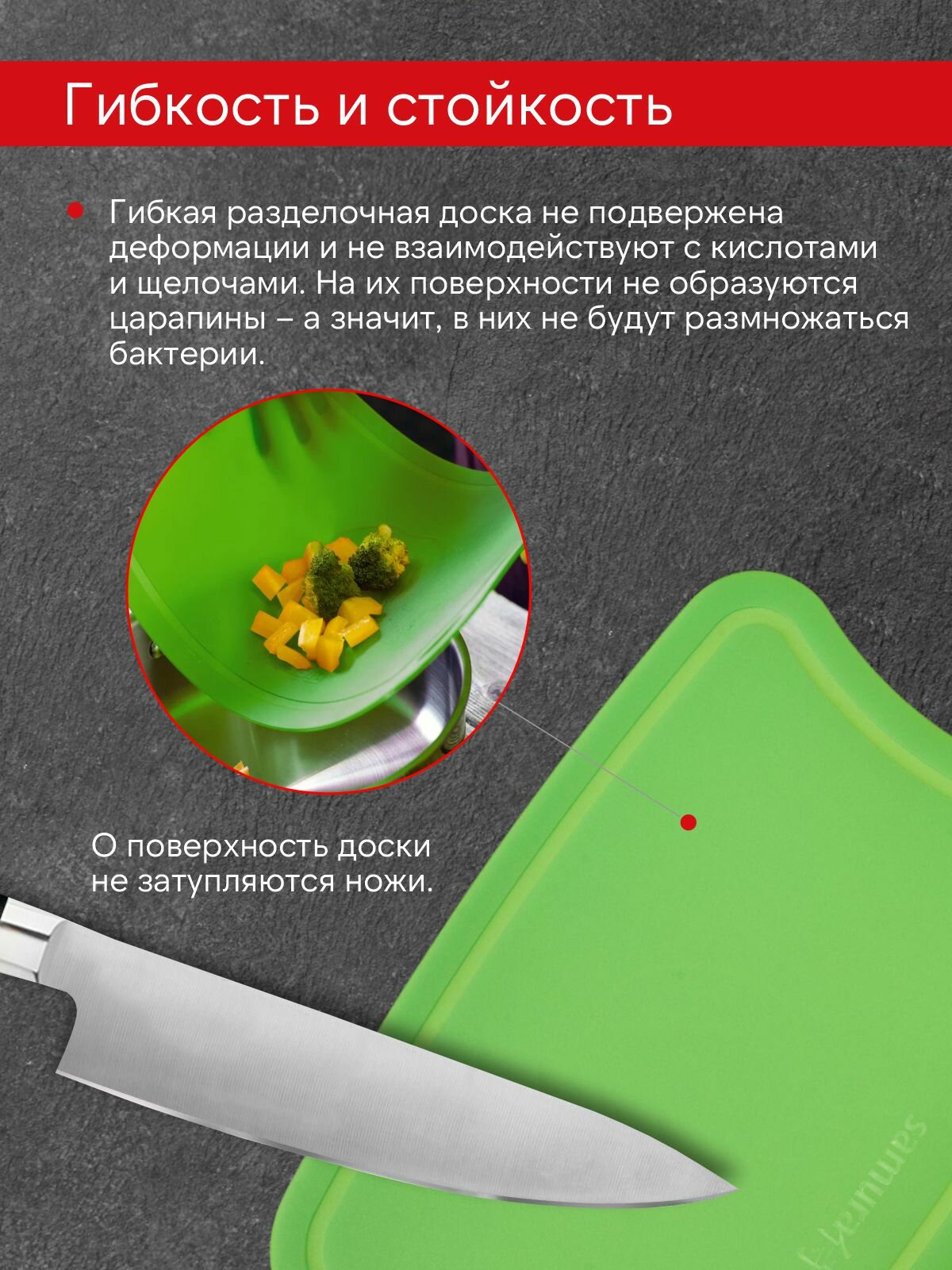 Важной особенностью является гибкость доски. Благодаря этому свойству, она не скользит по поверхности, обеспечивая стабильность и безопасность при работе с ножом.