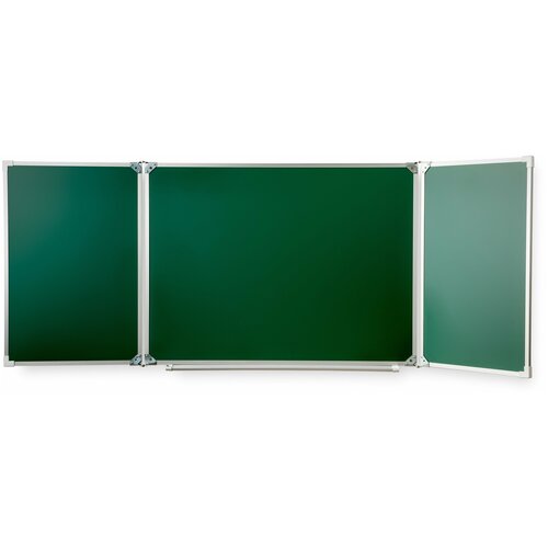 Ширина центральной части – 100 см, ширина боковых створок – по 50 см, высота 120см. Имеется лоток для мела/маркера и принадлежностей,