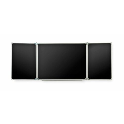 Ширина центральной части – 100 см, ширина боковых створок – по 50 см, высота 85см. Имеется лоток для мела/маркера и принадлежностей,