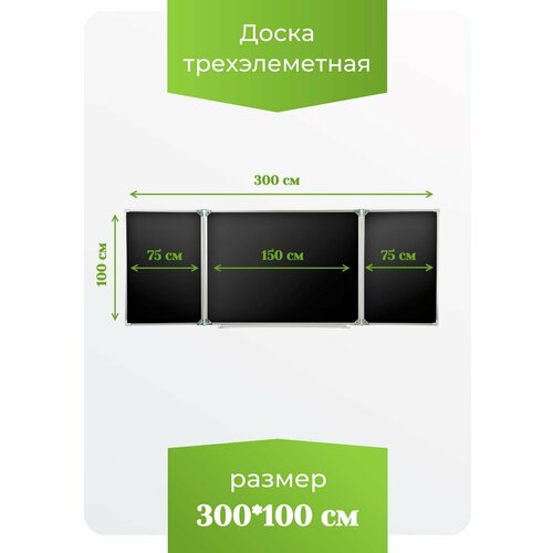 Ширина центральной части – 150 см, ширина боковых створок – по 75 см, высота 100см. Имеется лоток для мела/маркера и принадлежностей,