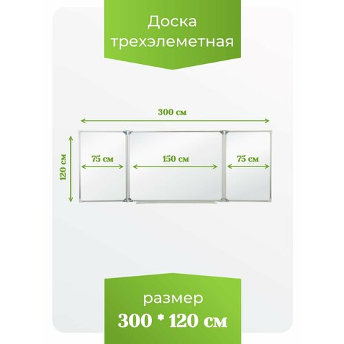 1-й элемент это центральная часть школьной доски, которая крепится к стене, а створки (2-й и 3-й элементы), могут независимо открываться и закрываться от плоскости центральной части доски до плоскости стены. Петли многоэлементных досок рассчитаны на нагрузку свыше 100 кг. Ширина центральной части – 150 см, ширина боковых створок – по 75 см, высота 100см. Имеется лоток для мела/маркера и принадлежностей,