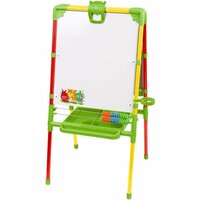 Мольберт предназначен для обучения и развития творческих способностей детей возрастом старше 3 лет. Мольберт имеет две рабочие поверхности, одна сторона предназначена для рисования мелом, а вторая — маркерами для досок, а также для размещения магнитных фигур и алфавита.