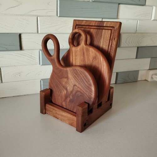 Набор состоит из трех разделочных досок(досок для подачи) и подставки, изготовленных из прочного и натурального дерева(карагач). Размеры: большая доска 2x21х28 см, средняя доска - толщина 2см, d- 23см. маленькая доска - толщина 2см, d- 19см и подставка 20х18 см. Комплект из натурального дерева тщательно отшлифован, глубоко пропитан натуральным маслом, а также совершенно безопасен для контакта с едой! Доски из дерева могут быть использованы как декоративная посуда, поднос, на котором можно расположить снеки, овощи, фрукты и многое другое! Рекомендации по уходу: промывайте изделие после использования под проточной теплой водой с помощью неагрессивных моющих средств и насухо вытирайте, запрещается мыть в посудомоечной машине и использовать в духовке или микроволновке, не замачивайте . Чтобы разделочная доска из дерева не трескалась, периодически обрабатывайте ее растительным или льняным маслом. Древесина карагач относится к ценным породам дерева. Во-первых, материал дерева очень прочный и износостойкий. Во-вторых, обладает высокой плотностью, что делает его очень гигиеничным. В-третьих, он имеет красивую текстуру и цвет, что делает его привлекательным для использования в качестве декоративной доски для подачи блюд. Разделочные доски имеют отверстие в углу, которое не только придает дополнительную изюминку дизайну, но и позволит удобно разместить ее на вашей кухне. За счет небольшого веса и специальной выемки для пальцев, доска может легко перемещаться. Наш комплект на подставке позволит вам удобно хранить после использования. Подача на доске из карагача станет изюминкой и украшением вашего заведения. Комплект досок с подставкой - компактное и удобное решение для кухни и дома! Набор разделочных досок - незаменимый помощник на каждый день!