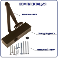 В комплект входит корпус дверного доводчика, тяга, крепеж, декоративный колпачок, паспорт изделия.