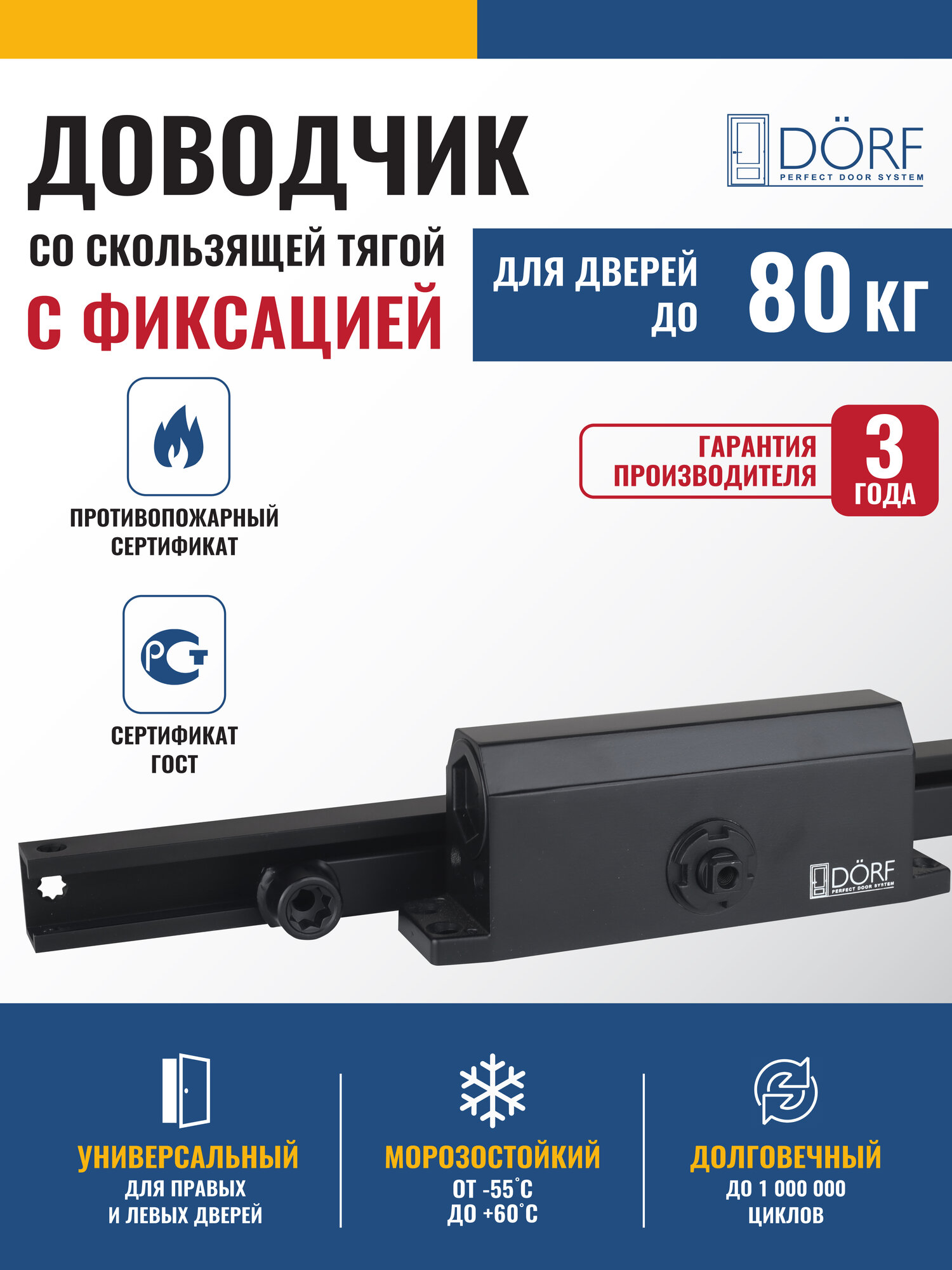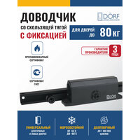 Дверной доводчик DORF L-8223 SLAIDE со скользящей тягой и фиксацией двери в открытом положении (Hold Open) — это устройство, которое обеспечивает плавное и тихое закрытие двери. Подходит для любых дверей и калиток массой до 80 кг: металлических, пластиковых, деревянных; левых и правых. Он особенно полезен в местах с высокой проходимостью, так как предотвращает хлопанье дверей и снижает износ дверных петель.