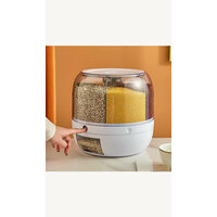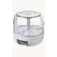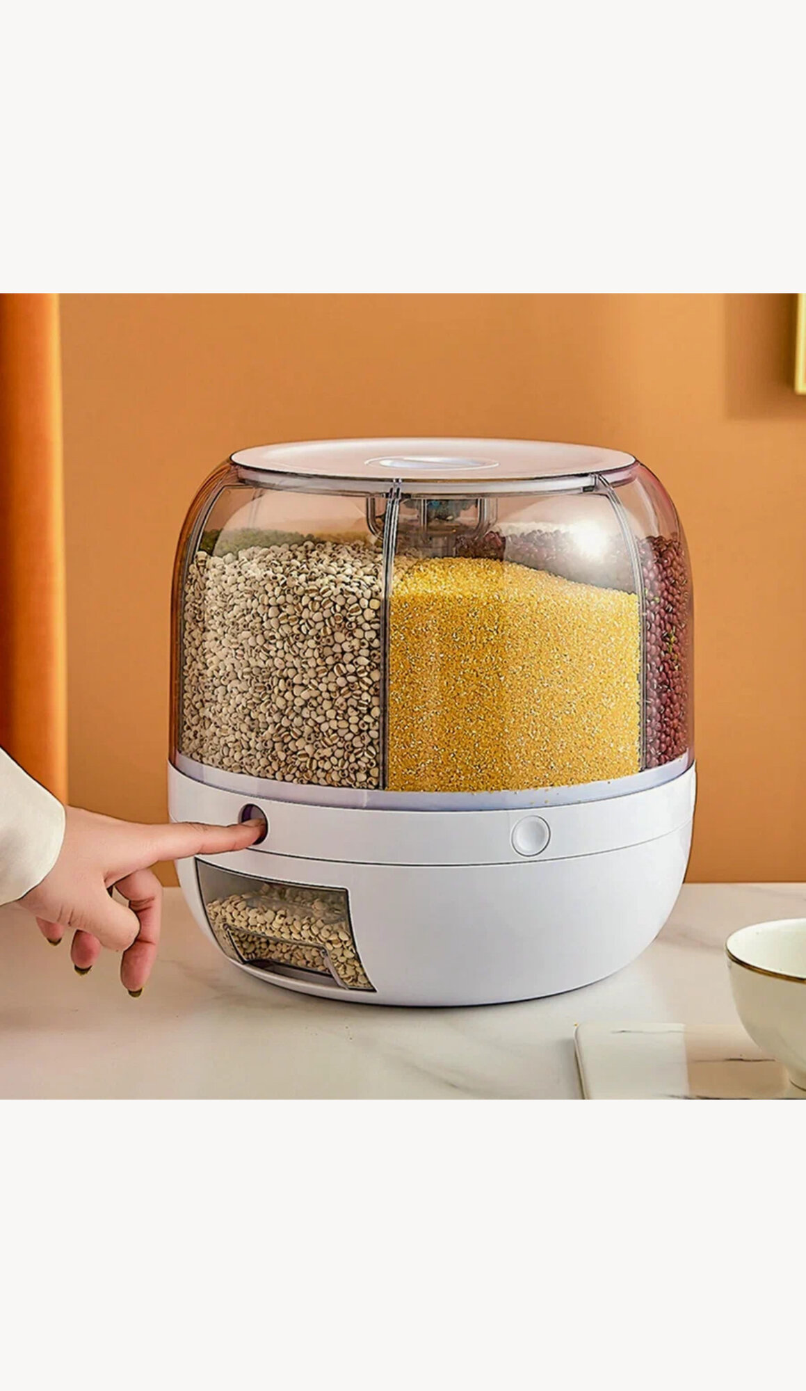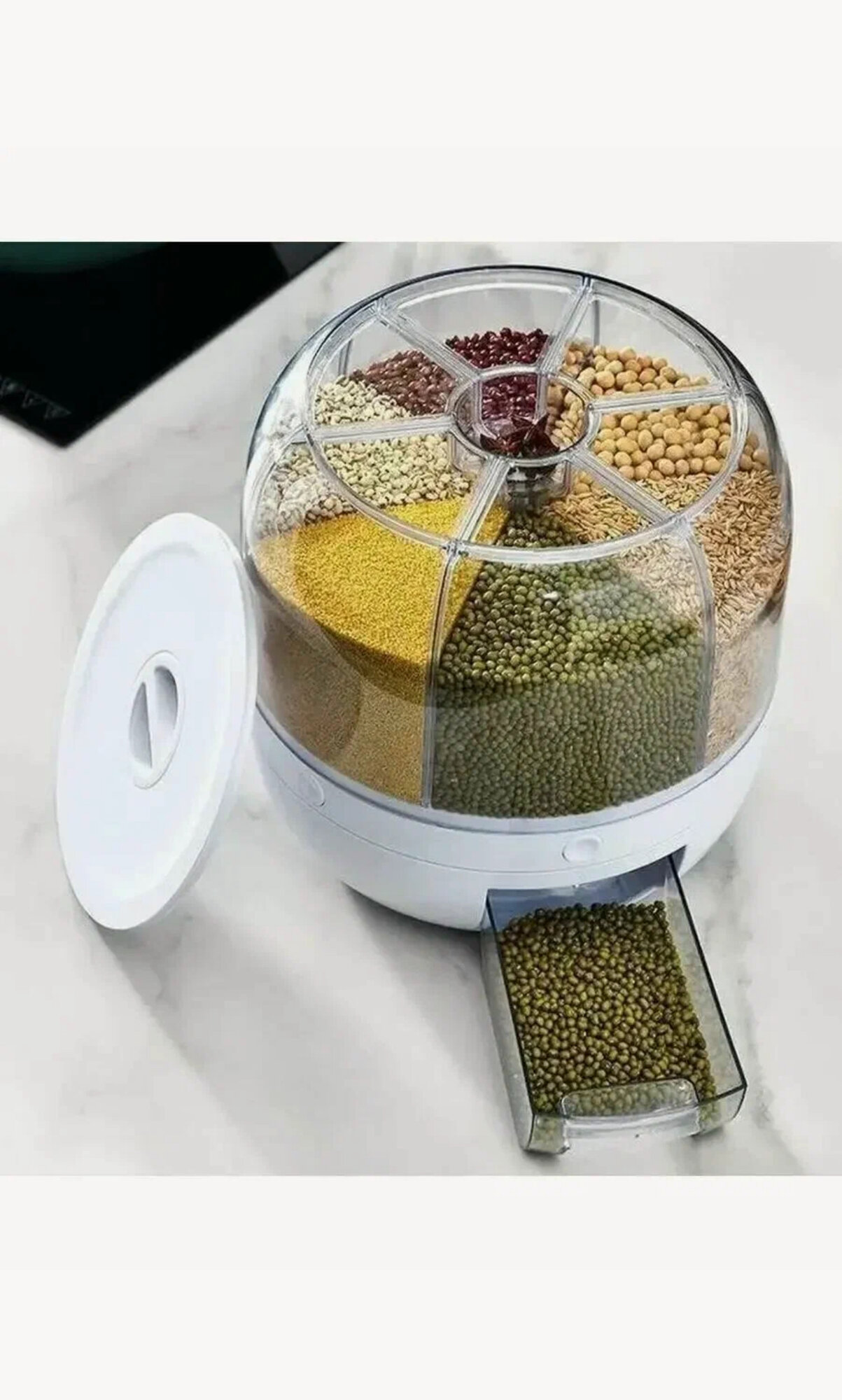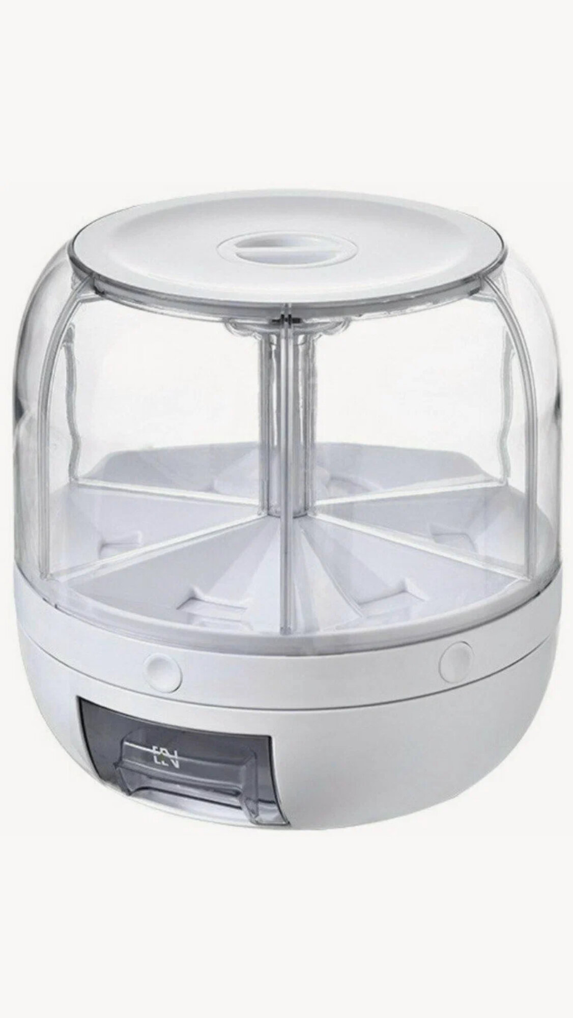 Диспенсер кухонный органайзер – новинка для современных хозяек. Диспенсер для круп с шестью вместительными отсеками поможет в организации хранения сыпучих продуктов на вашей кухне. Многоразовый пластиковый контейнер выполнен из экологически чистых материалов и абсолютно безопасен для здоровья, имеет прозрачный корпус и плотную крышку, защищающую продукты от загрязнения, попадания влаги и предотвращающую проникновение насекомых-вредителей. Ёмкость для сыпучих продуктов вращается на 360 градусов на подставке и, благодаря размеру, впишется в полку для кухни или в кухонный шкаф. Вам не нужно каждый раз доставать контейнер - просто поверните его нужной стороной, нажмите на кнопку и отмерьте необходимое количество продукта. Органайзер для круп 6 в 1, с дозатором подходит для пищевых продуктов: крупы, риса, гречки, гороха, пшена, семечек, чая, кофе в зёрнах, орехов, для мюсли и многого другого. Главным преимуществом емкости для кухни является экономия места, так как она вмещает 6 видов продуктов. Новый дизайн кухонного контейнера украсит любой интерьер и станет незаменимым помощником для хранения сыпучих продуктов. Такой аксессуар для кухни так же является отличным подарком на день рождения маме, 8 марта бабушке, на новый год сестре, на свадьбу коллеге, подруге тёте и просто для себя любимой.