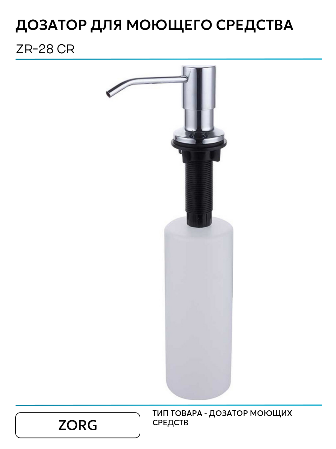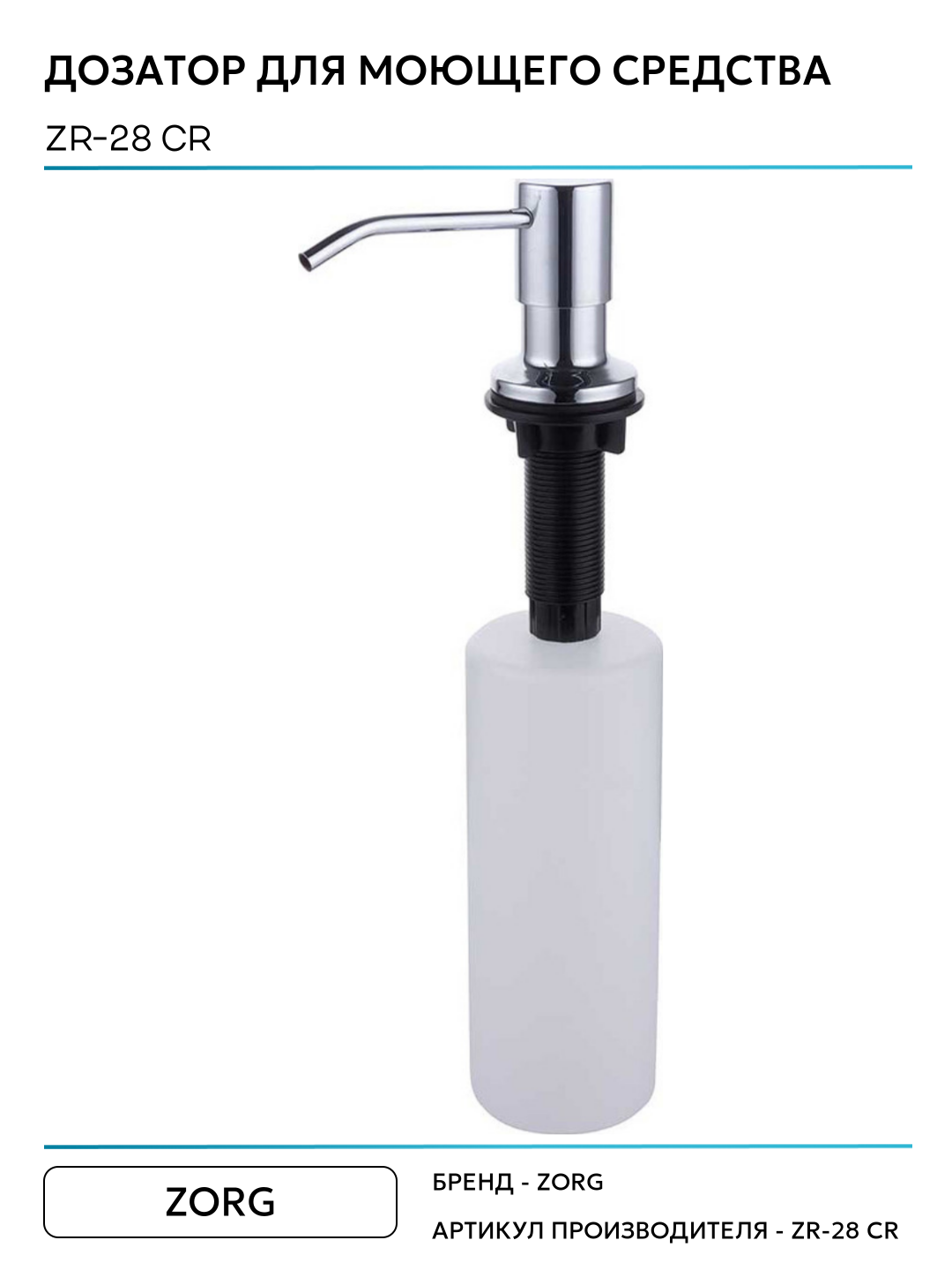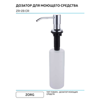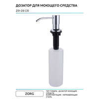 Дозатор жидкого средства Zorg ZR-28 CR хром полированный, встраиваемый диспенсер для жидких средств. Встраиваемый дозатор ZorG предназначен для экономии пространства на кухне и помощи в мойке посуды. Сам дозатор встраивается в кухонную мойку или столешницу. Для установки дозатора необходимо сделать отверстие. Воспользовавшись дозатором для жидкого мыла, моющего средства, Вы забудете о вечно падающем моющем средстве, о нагромождении рабочего пространства лишними бутылками и мыльницами . Помимо удобства он придаст более эстетичный вид вашей кухне. Как пользоваться диспенсером ZorG? - дозатор монтируется в отверстие 25-30 мм, нижняя колба крепится под столешницей или мойкой, верхняя часть дозатора на столешнице или на мойке. - залейте моющее средство. Для этого необходимо просто поднять верхнюю часть дозатора! Не нужно каждый раз откручивать и прикручивать колбу снизу. Жидкость заливается сверху. - нажмите на дозатор и используйте жидкое средство по назначению.