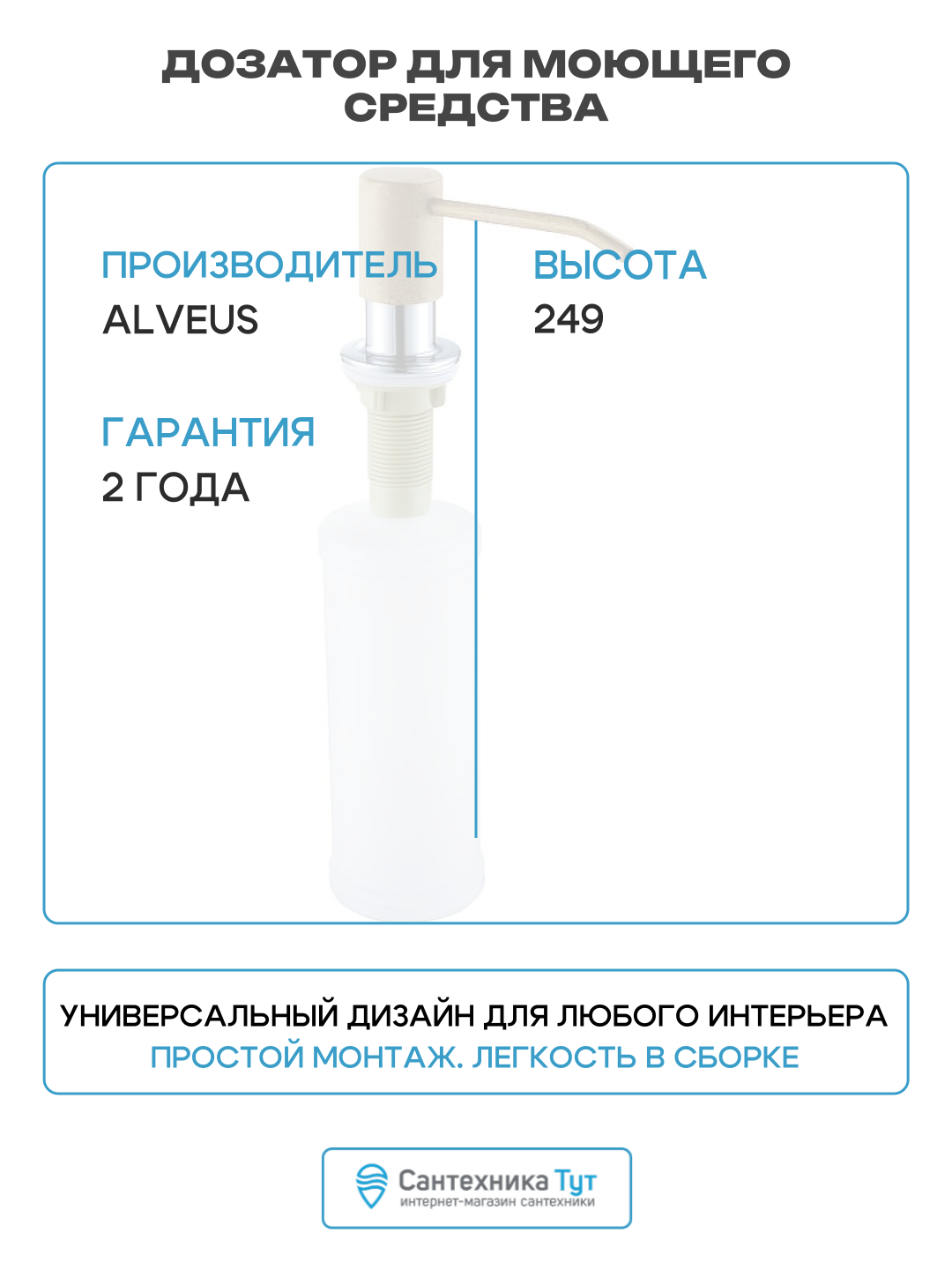 Вам надоели бесконечные разводы и следы от бутылочек с жидким мылом и моющим средством? Тогда встраиваемый дозатор от ALVEUS- это то, что Вам нужно. Практичный, современный дизайн, гарантия 2 года от ведущего европейского производителя товаров для оснащения кухни. Характеристики: - легко заправляется сверху; - диаметр отверстия под дозатор 28-35 мм; - вместительная колба; надежный механизм крепления. Материал высококачественный пластик. Объем колбы 0,32 л. Идеально сочетается с мойками ALVEUS GRANITAL