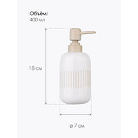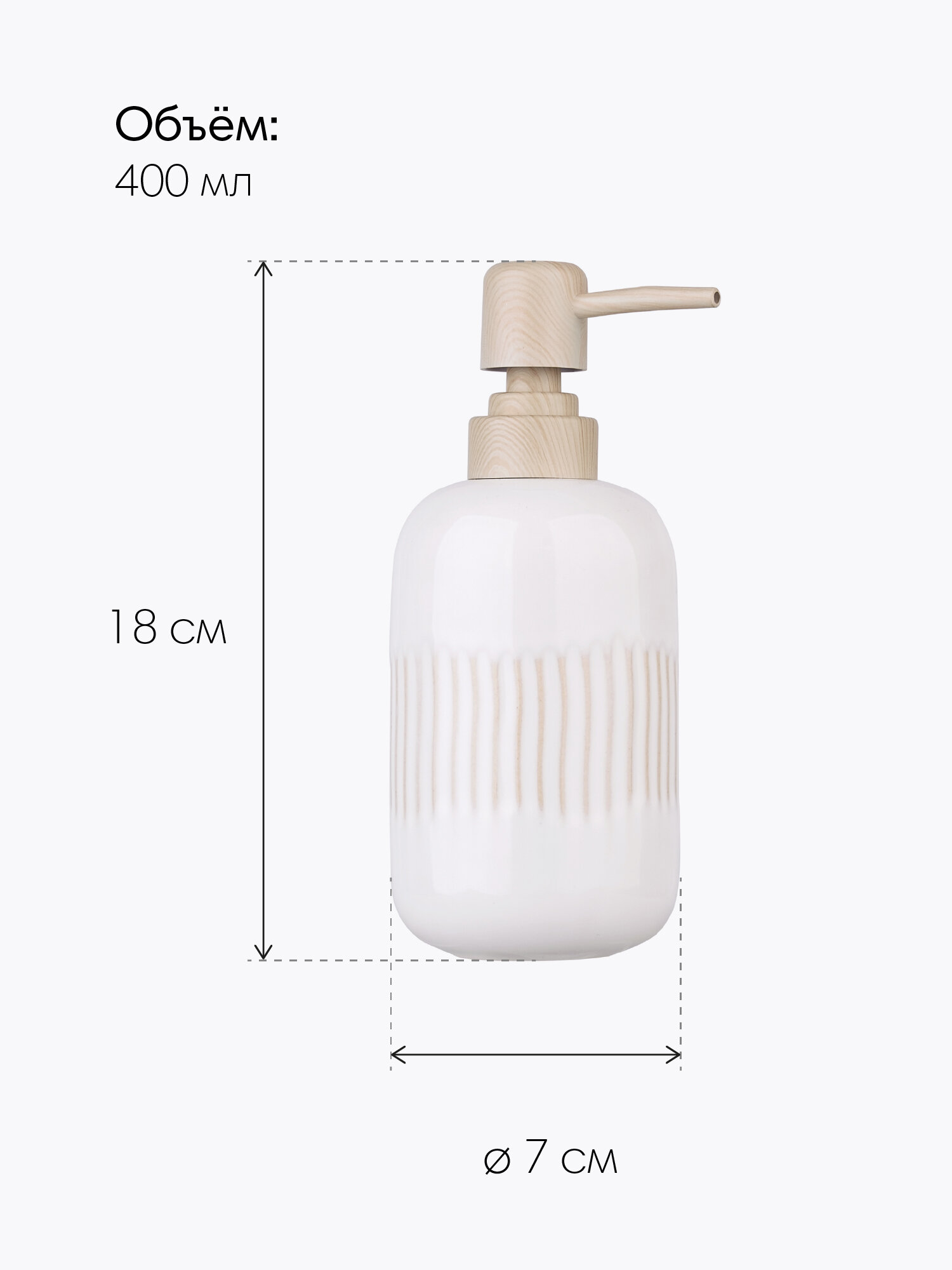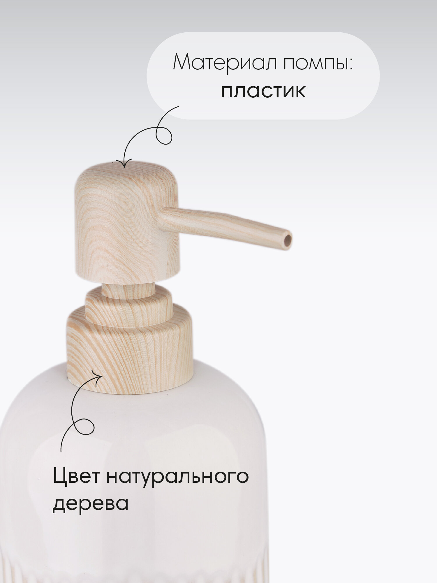 Дозатор для жидкого мыла 400 мл Nebeskvit бежевого цвета. Колба имеет рисунок, состоящий из рельефных полосок. Носик сделан из пластика под дерево. Является частью коллекции Nebeskvit, которая представлена в Likemyhome в полном составе. Оформите ванную комнату аксессуарами серии, которая станет универсальным решением для вашей ванной комнаты. Протирать с помощью мыльного раствора мягкой тряпкой. Не рекомендуется использовать абразивные и химически активные вещества для ухода за изделием. Не класть в морозильник, посудомоечную машину, микроволновую печь. Носик из пластика Покрытие: глянцевая глазурь Рельефная поверхность предмета