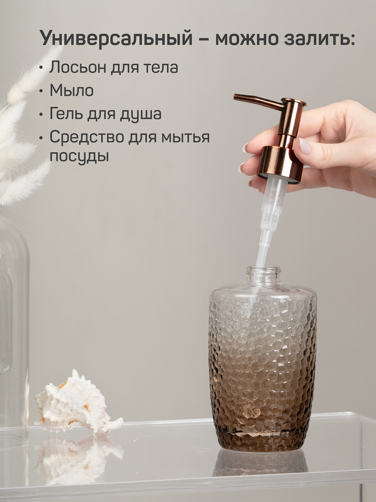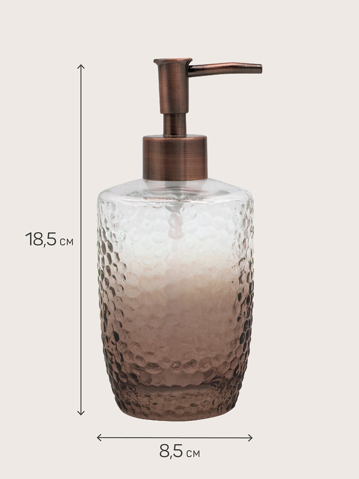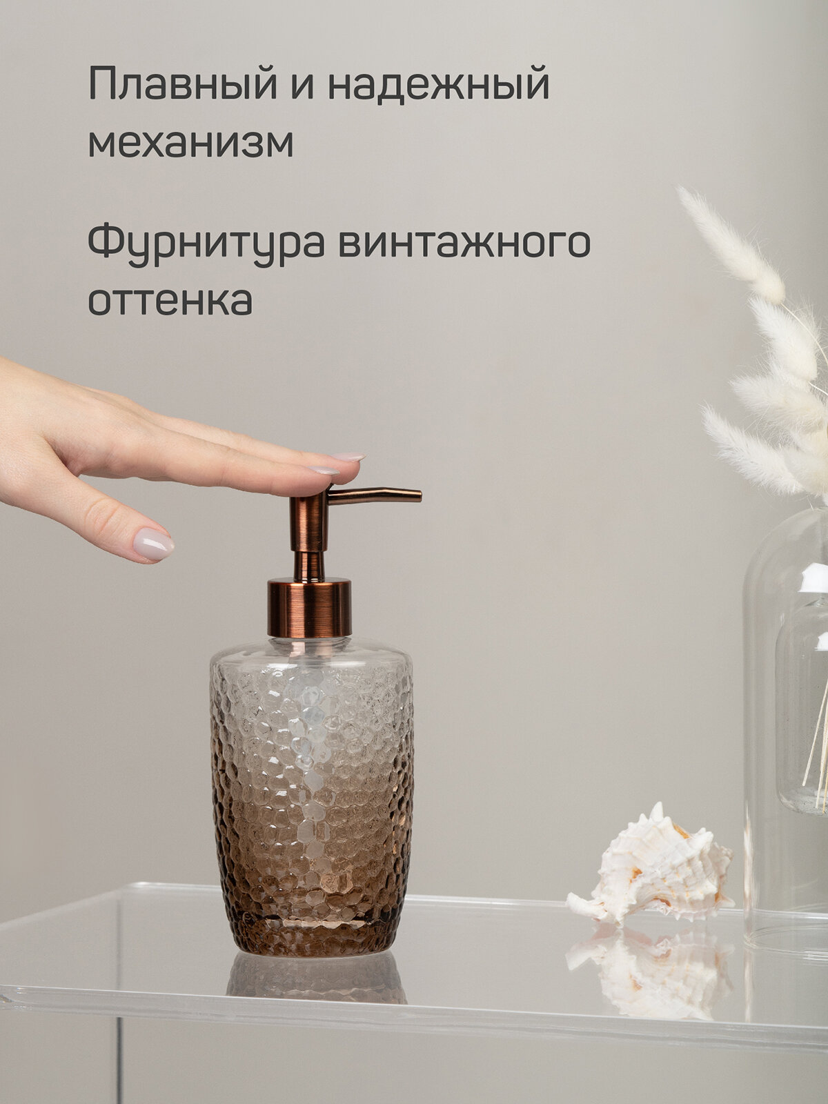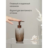 Дозатор для жидкого мыла VINTAGE выполнен из прозрачного коричневого стекла повышенной прочности с рельефным рисунком.